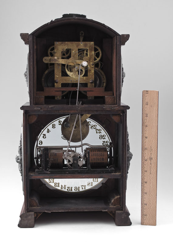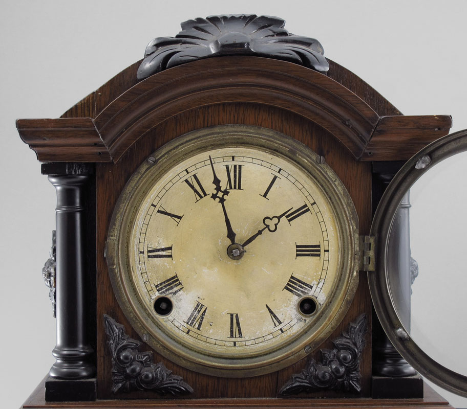 CONDITION: Currently running and strikes on the hour, however not guaranteed to continue. Note missing trim on crown, rubs to paper dial, pendulum hangs slightly askew.