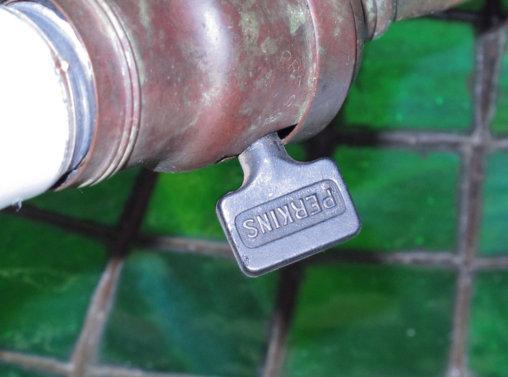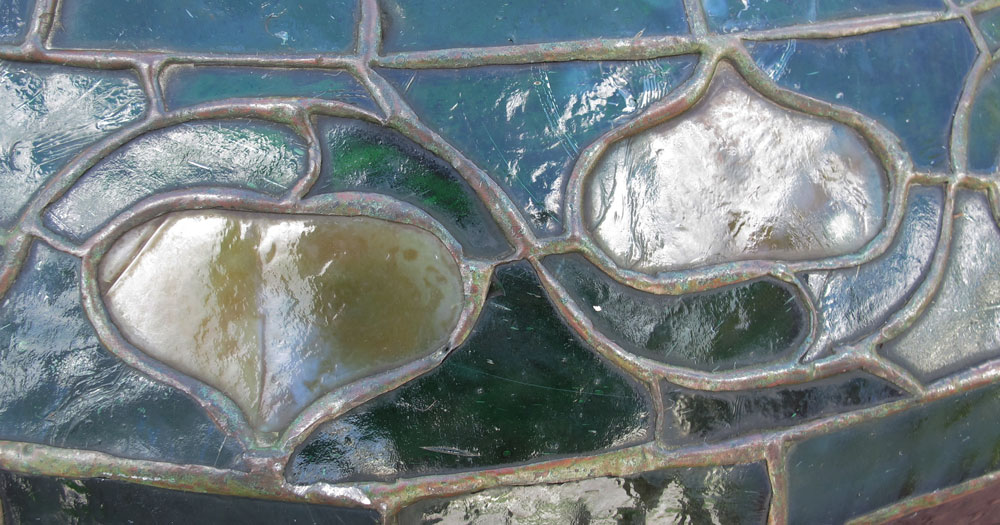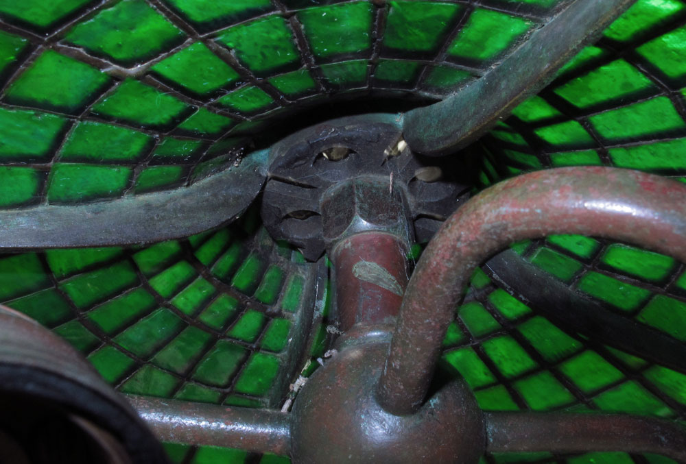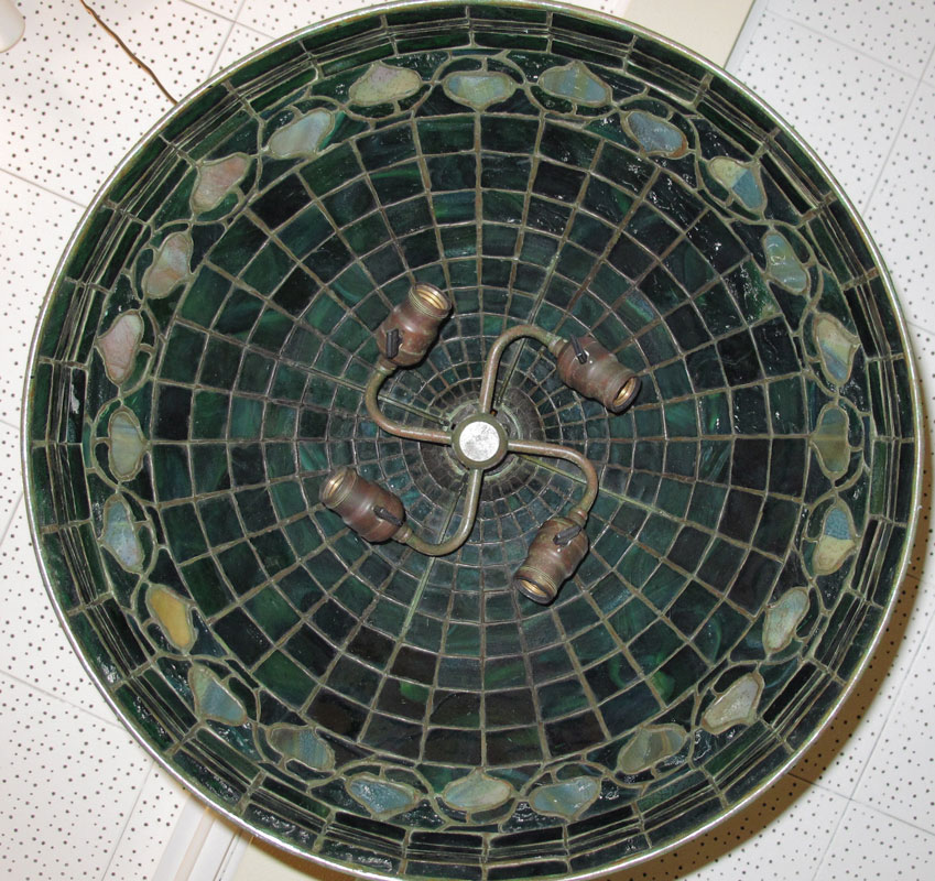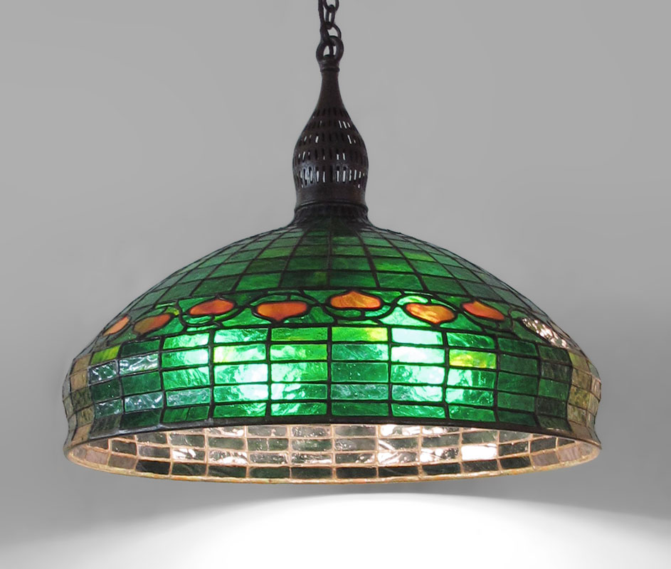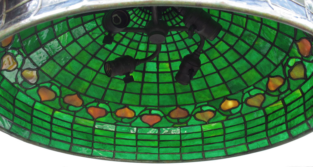 TIFFANY ERA ACORN HANGING LAMP: Four swirling arms reaching out to 4 original turn of the century paddle sockets by Perkins. Approx. 21'' h. excluding chain x 22'' dia. shade.