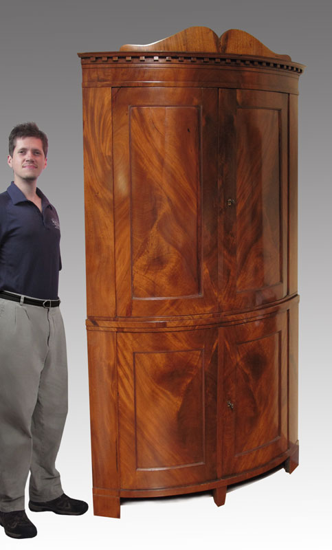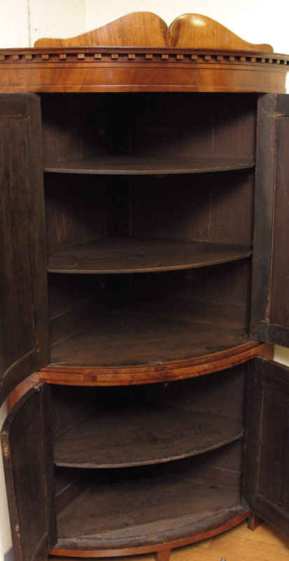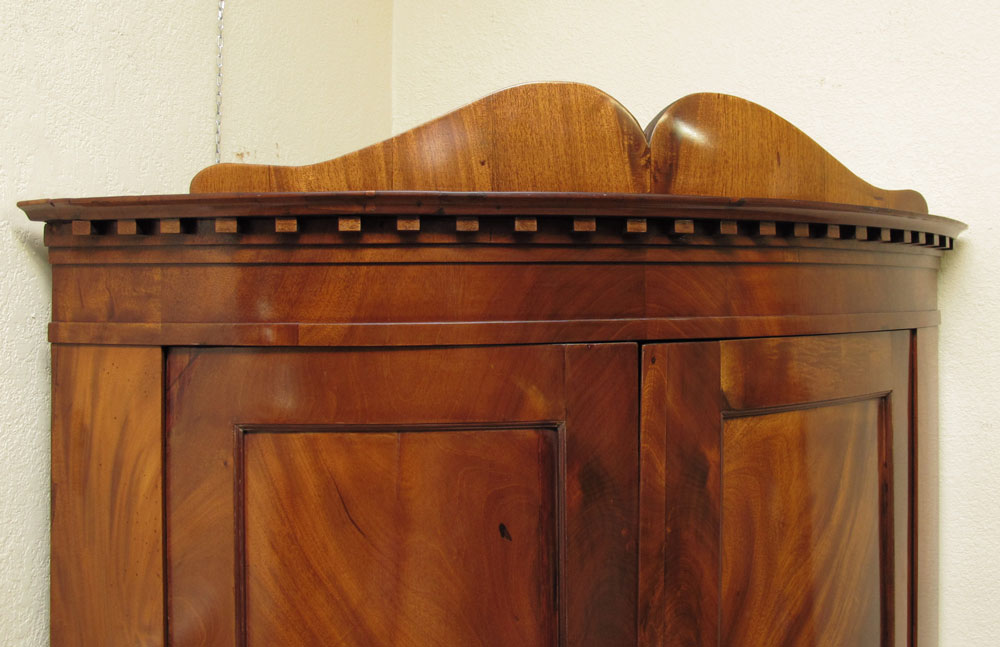 GEORGIAN MAHOGANY CORNER CABINET: Bow front form. Shaped cornice over dentil molding. Oak interior, boldly grained mahogany veneer. Four doors, key locking. Approx. 87'' tall x 29'' deep.