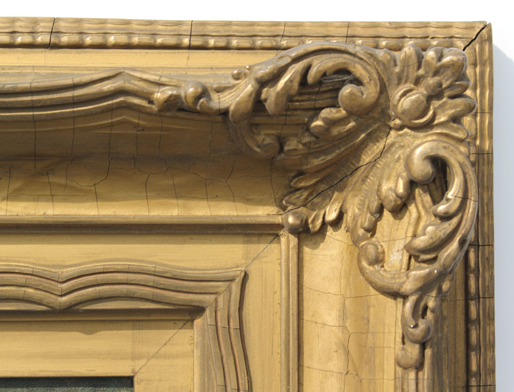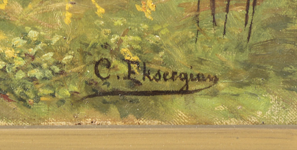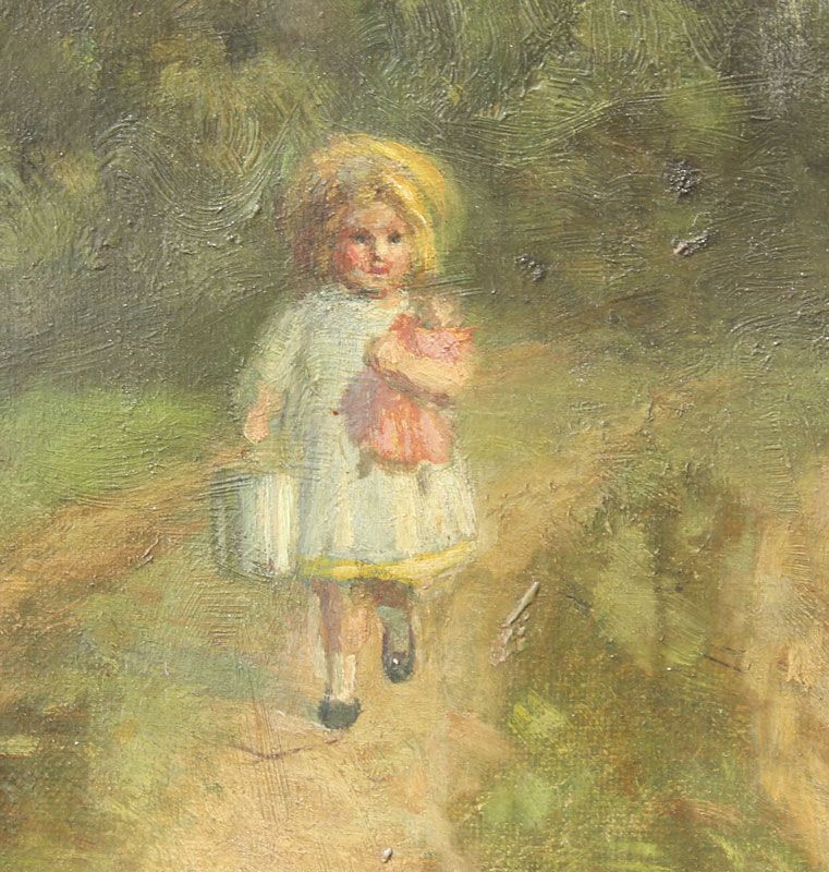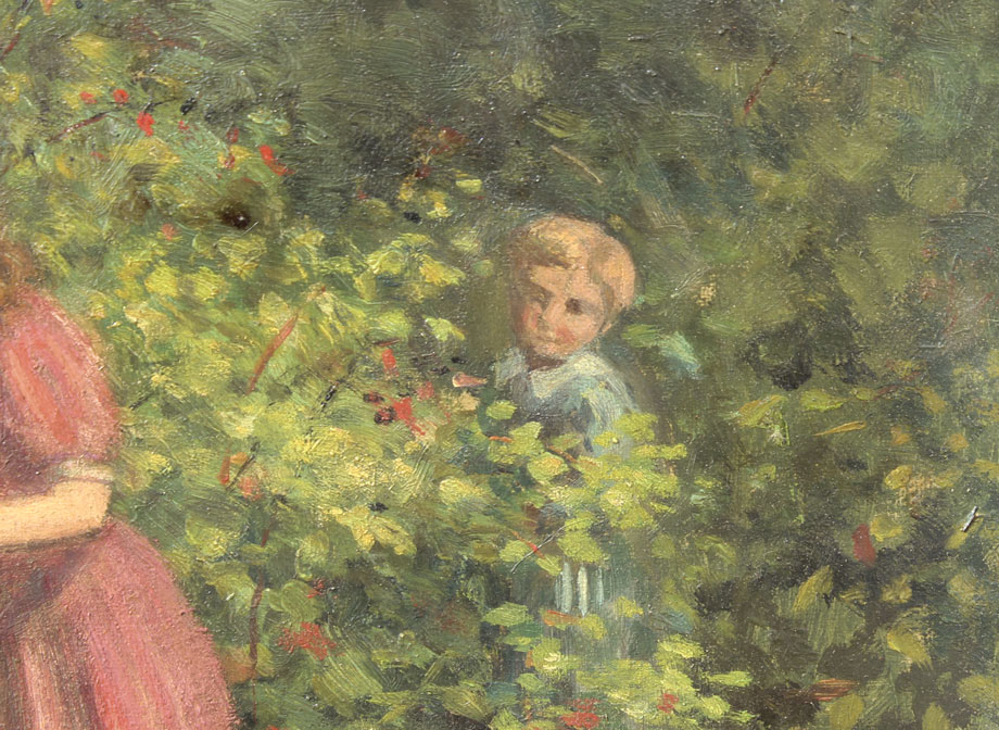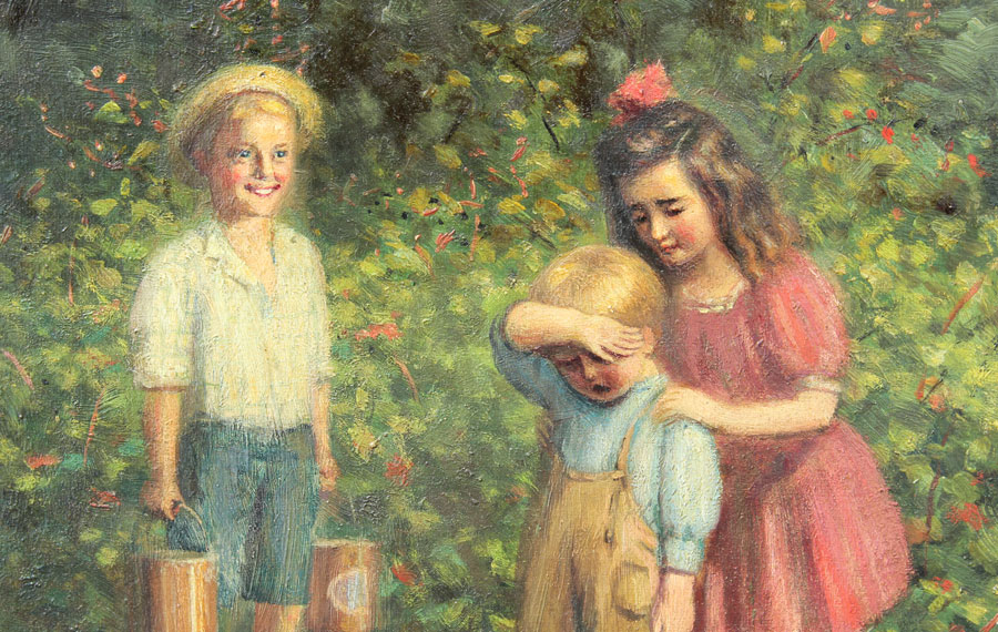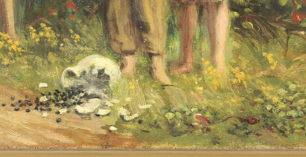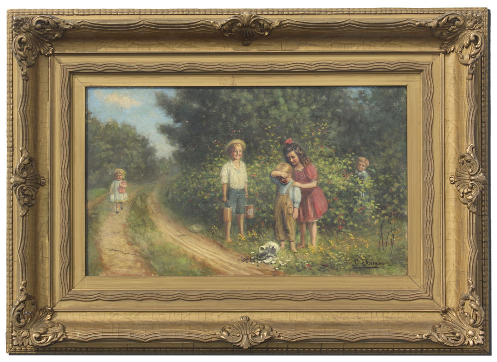 EKSERGIAN, Carnig, (Turkish/American, 1855-1931): ''The Broken Berry Pitcher'', girl consoling young child, with other children looking on, Oil/Canvas, 12'' x 20'', signed lower right, encased in period gilded and pierce carved gesso frame, 21 1/2'' x 29 1/2''.