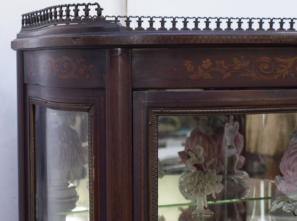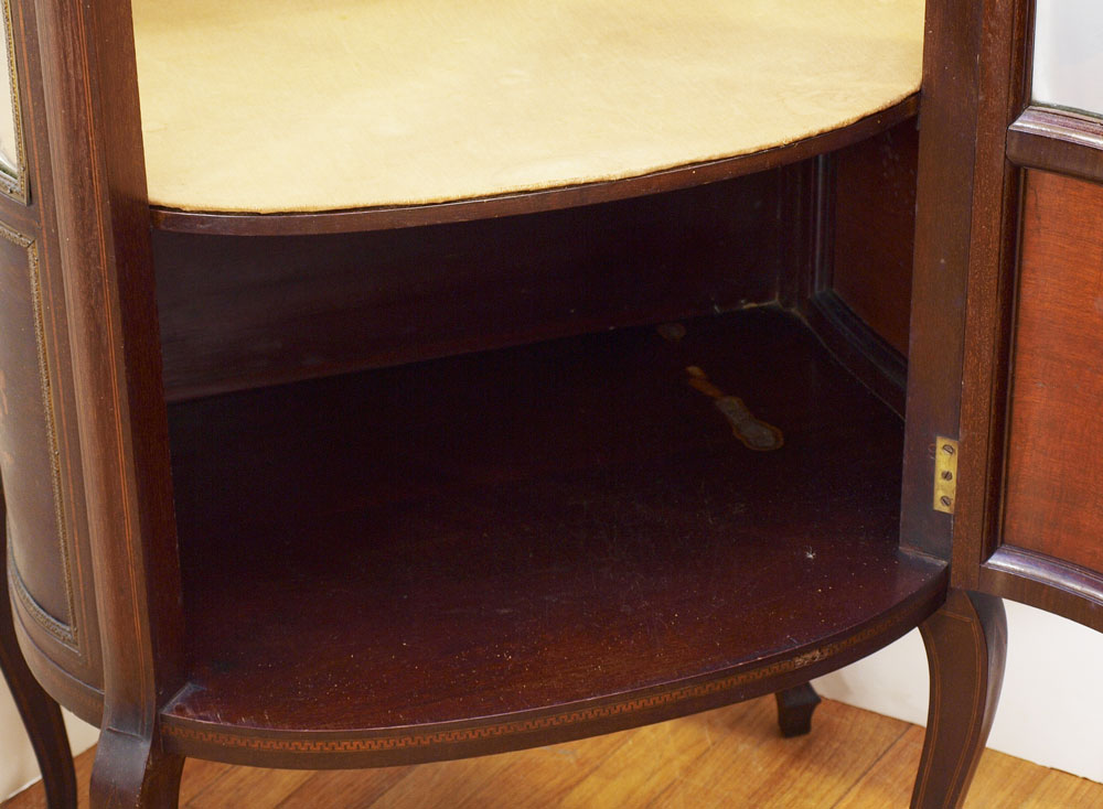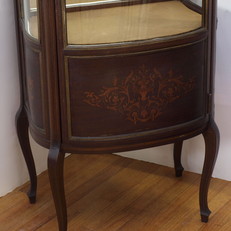 FRENCH VITRINE CURIO DISPLAY CABINET: Single door with bowed glass and blind bottom, shaped glass side panels, inlaid foliate scroll, musical instruments and string inlay decoration, cast metal gallery. Mirrored back interior with 2 glass shelves. 60 3/4'' h. x 25'' x 16 1/2''.