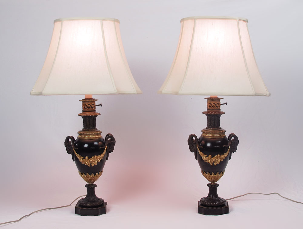 PAIR OF FRENCH EMPIRE STYLE MARBLE RAMS HEAD LAMPS: Black marble body and base, metal rams heads and gilt metal swags. Lamps measure approx. 33'' h. overall.