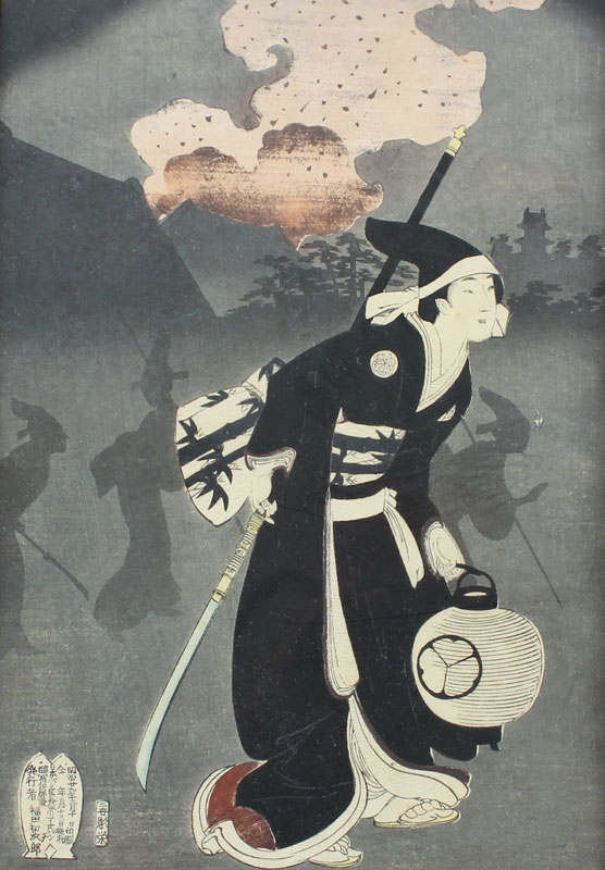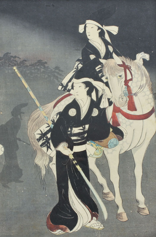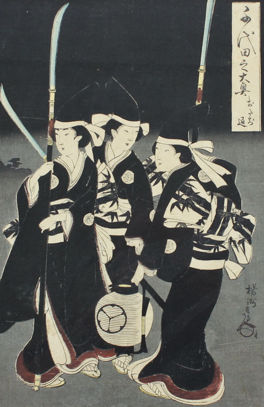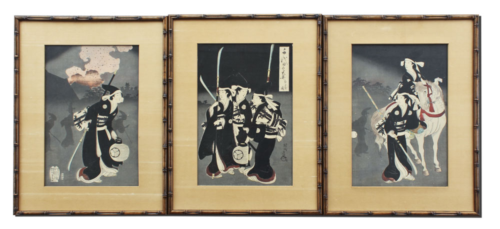 CHIKANOBU, Toyohara, (Japanese, 1838-1912): 3 Japanese Wood Block Prints featuring Female Warriors, sight size 15 1/2'' x 9'', published by Fukuda Kumajiro, encased in matching bamboo frames, 19 1/2'' x 15''. Not examined out of the frames.