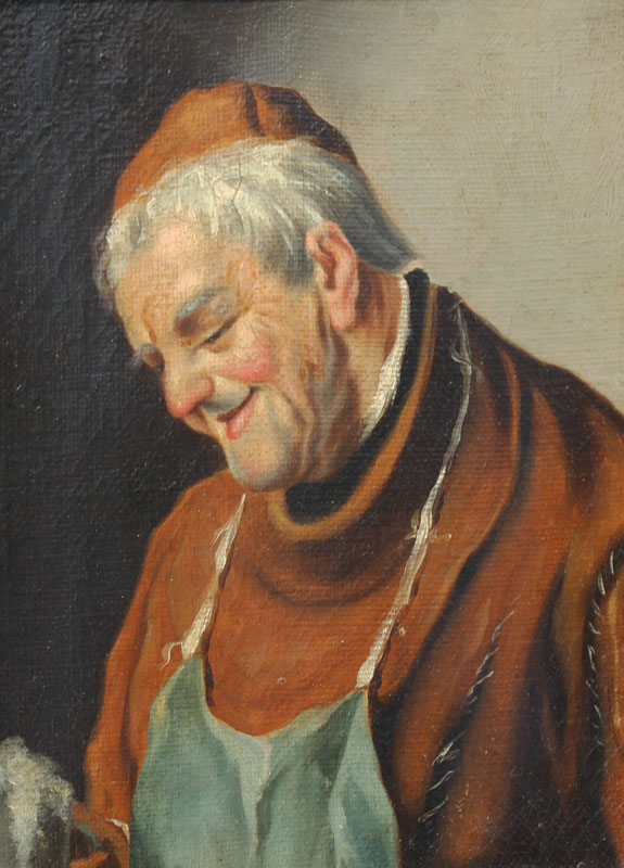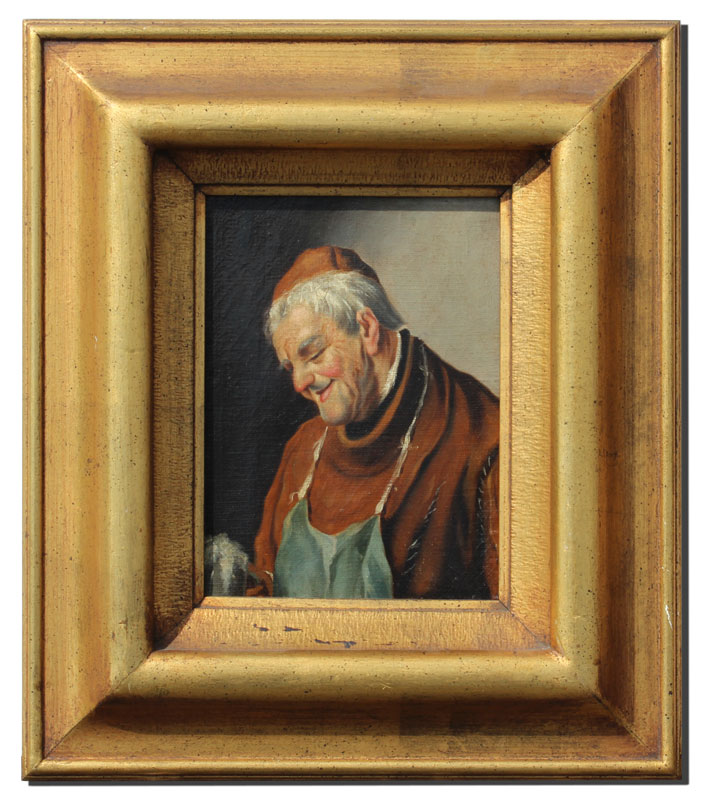 LATE 19TH C. PORTRAIT OF A FRIAR ADMIRING A FROTHY TANKARD: Oil/Canvas, 8'' x 6'', unsigned, encased in gilded frame with wear, 14 1/2'' X 12 1/2''.