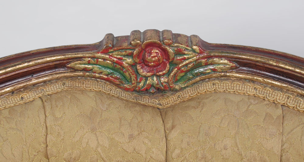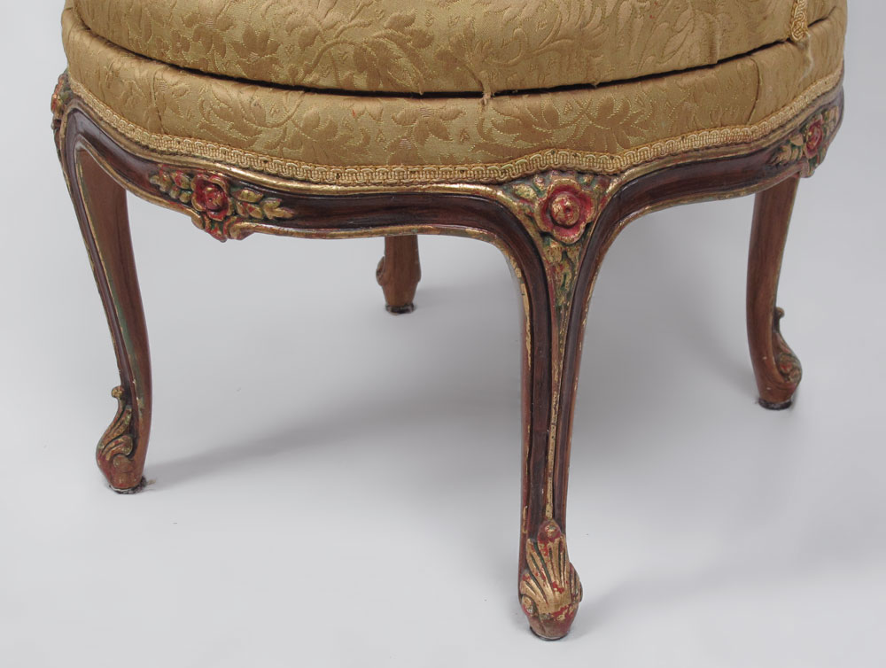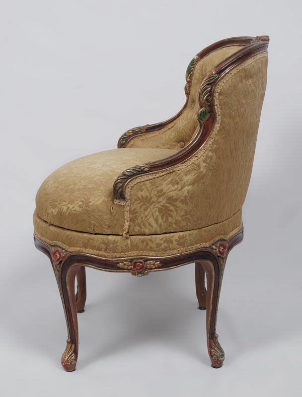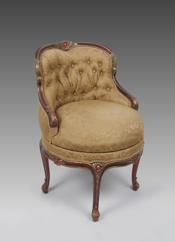 CARVED ITALIAN STYLE SWIVEL CHAIR: Carved and painted floral decoration with floral design gold upholstery. Chair swivels 360 degrees. 32 1/4'' h. x 21 1/2'' x 24 1/4''.