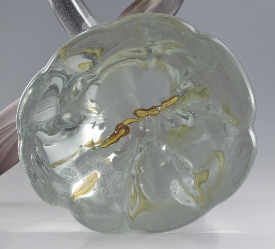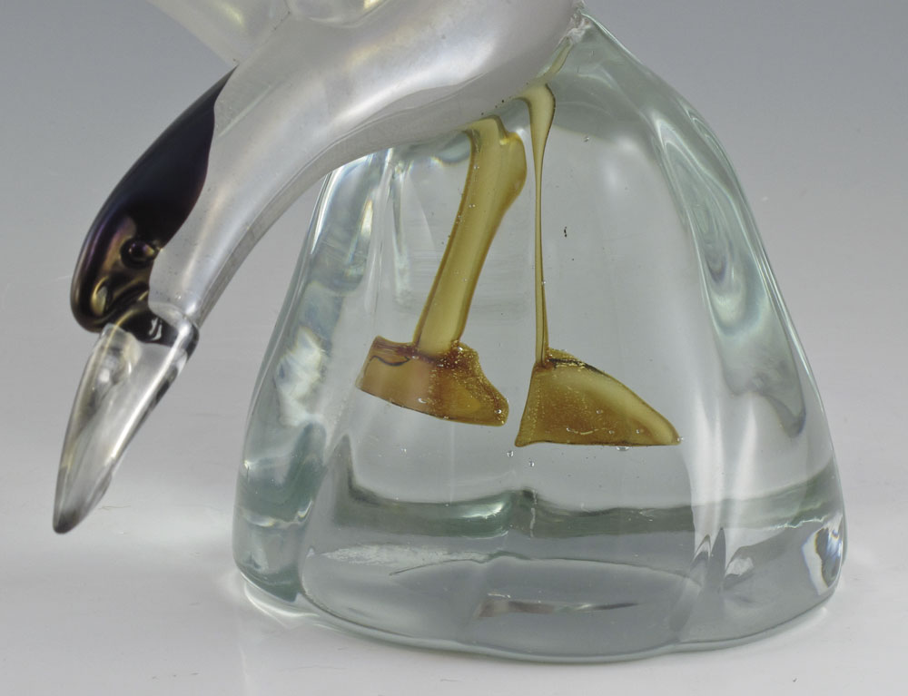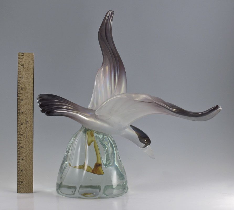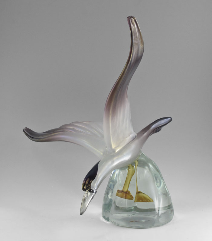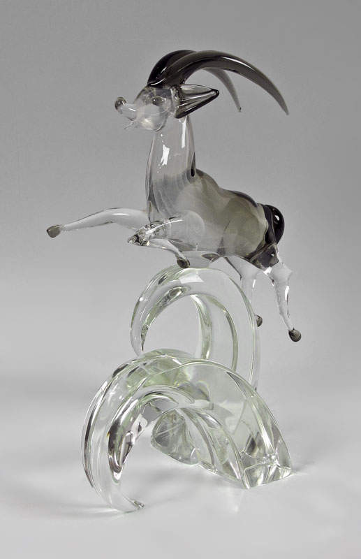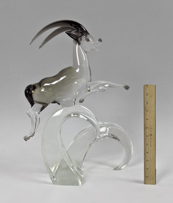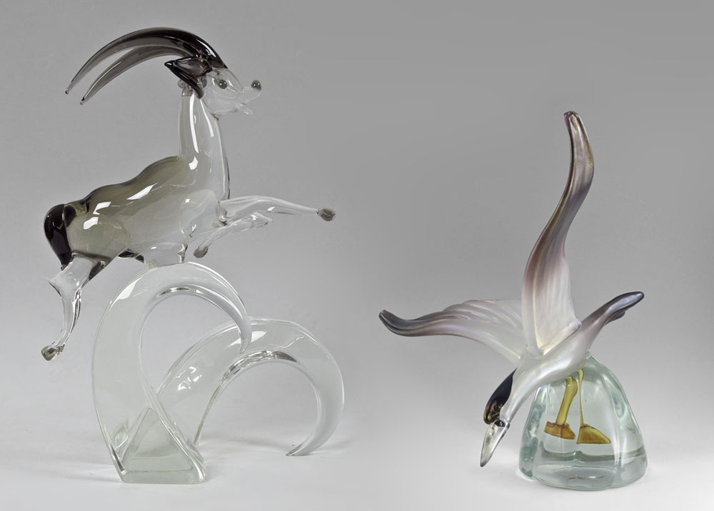 ITALIAN GLASS GAZELLE & BIRD IN FLIGHT SCULPTURES: To include 1) Licio Zanetti leaping gazelle on heavy wave form glass base. Signed. 20'' h. x 14'' x 9''. 2) Unsigned water bird with feet ''underwater'' in glass base. 16 1/2'' h. x 18'' x 12 1/4''.
