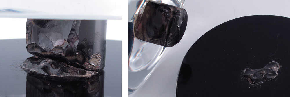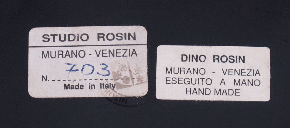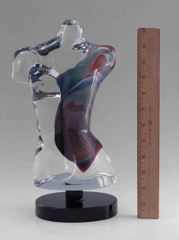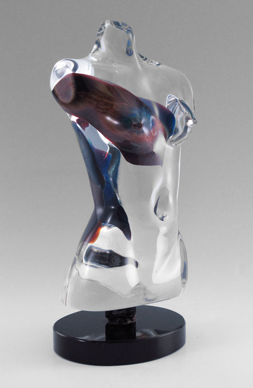 DINO ROSIN APHRODITE GLASS SCULPTURE: Approx. 13'' h. overall, incised signature, labels affixed beneath, unfortunately this is in 2 pieces, and is in need of repair.