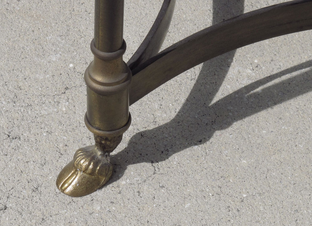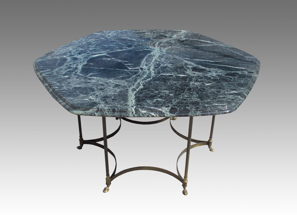 HEXAGONAL MARBLE TOP TABLE: Heavy marble top on curved hexagonal base, each of the 6 legs ending in cast hooves. Marble 29 1/2'' h x 58'' dia.