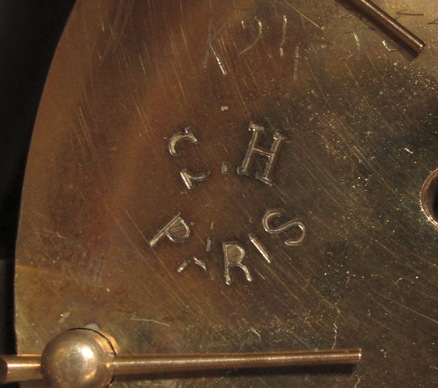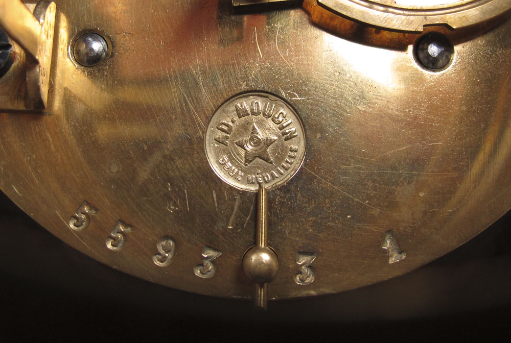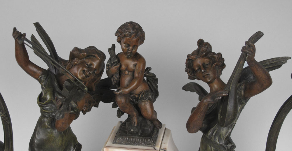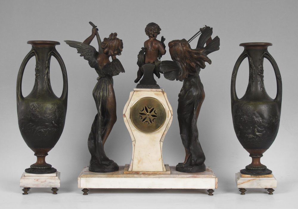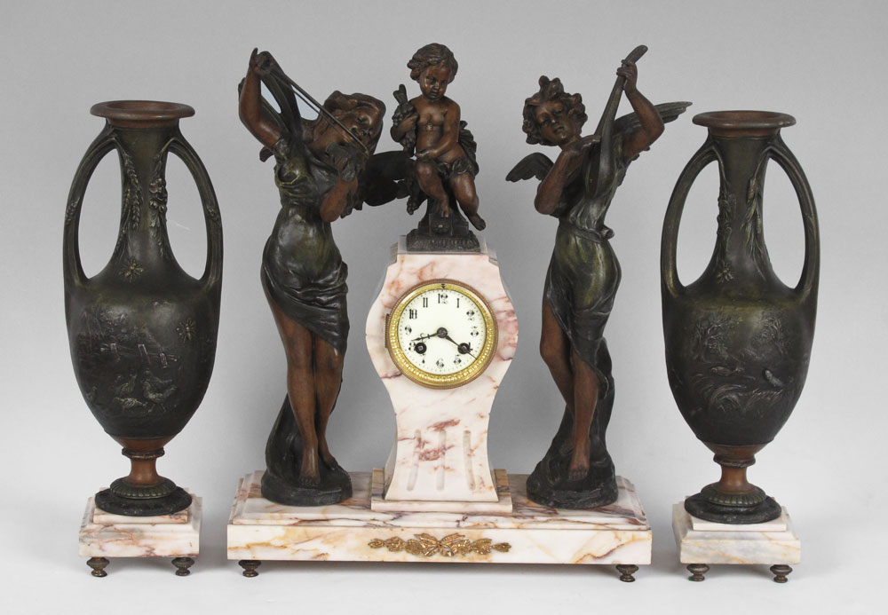 FRENCH FIGURAL MARBLE CLOCK GARNITURE SET: Marble case surmounted with figural angel and fairy musicians and topped with cherub on marble base raised on 4 feet. Porcelain dial with Arabic numerals. Ad. Mougin French time and strike movement, key and pendulum in office. 18 1/4'' h. x 14 3/4'' x 5 3/4''. Sold with matching vase form garniture featuring chickens in the farm yard on one side, fish leaping from a spring on the other. 16'' x 5 1/2''.