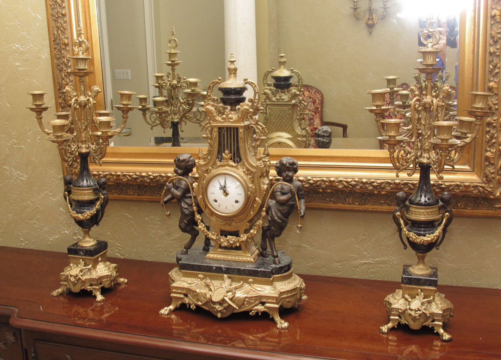 IMPERIAL FIGURAL CLOCK GARNITURE SET: Figural pan children, cast metal body with black variegated marble accents. Key wind time & strike movement. 24'' h. x 14'' x 8''. Sold with pair of matching 7 light candelabra, 27'' h. x 10''. Key in office.
