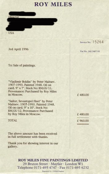 MALTSEV, Peter, (Russian, 1907-): Sailor, Sevastopol Fleet, 1948, Oil/Board, 9'' x 10'', titled lower left, custom black frame, 14 1/4'' x 15 1/4''. Provenance; Roy Miles Fine Paintings, London. Copy of original receipt available.