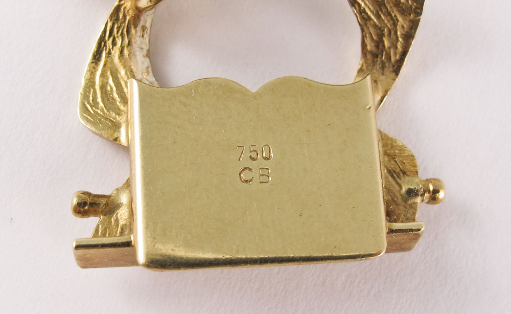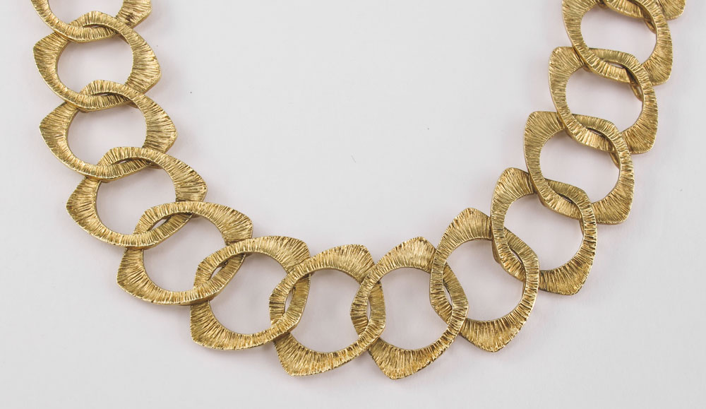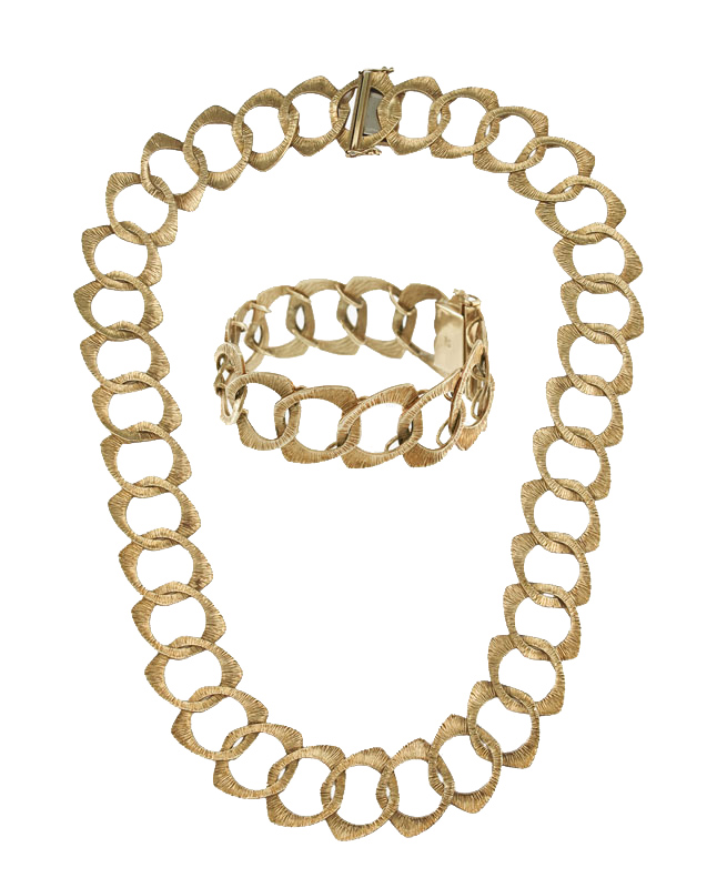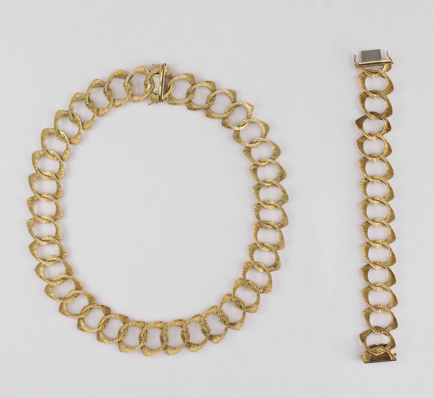18K CARL BUCHERER NECKLACE AND BRACELET: In the original presentation box. Textured 18K yellow gold open link necklace and bracelet set. Purchased in 1964. Weight: 111.4 Grams.