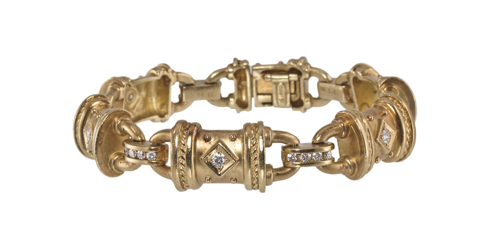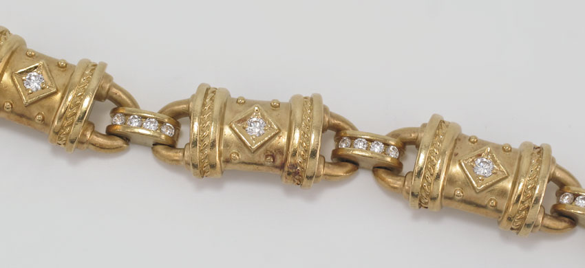 18K SEIDENGANG DIAMOND BRACELET: 18K yellow gold bracelet contains 30 round brilliant cut diamonds, total weight approx. 1.25 Ct. The diamonds average VS in clarity and G-H in color. The diamonds are prong and channel set. Hidden hinged safety clasp. Weight: 52.4 grams. Length: 7''.
