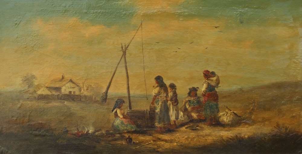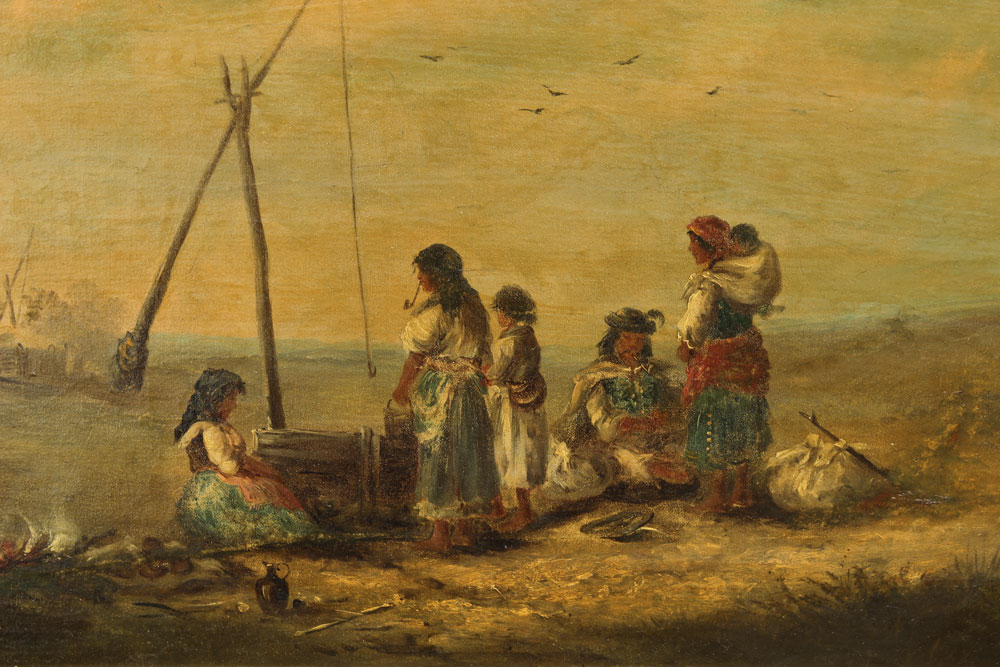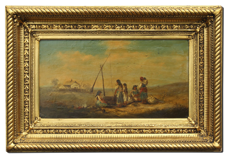 PAINTING OF GYPSY CAMPSITE WITH FIGURES: 19th C., Oil/Canvas, 16'' x 26 1/4'', no visible signature, carved and gilded frame, 21 1/2'' x 32''.
