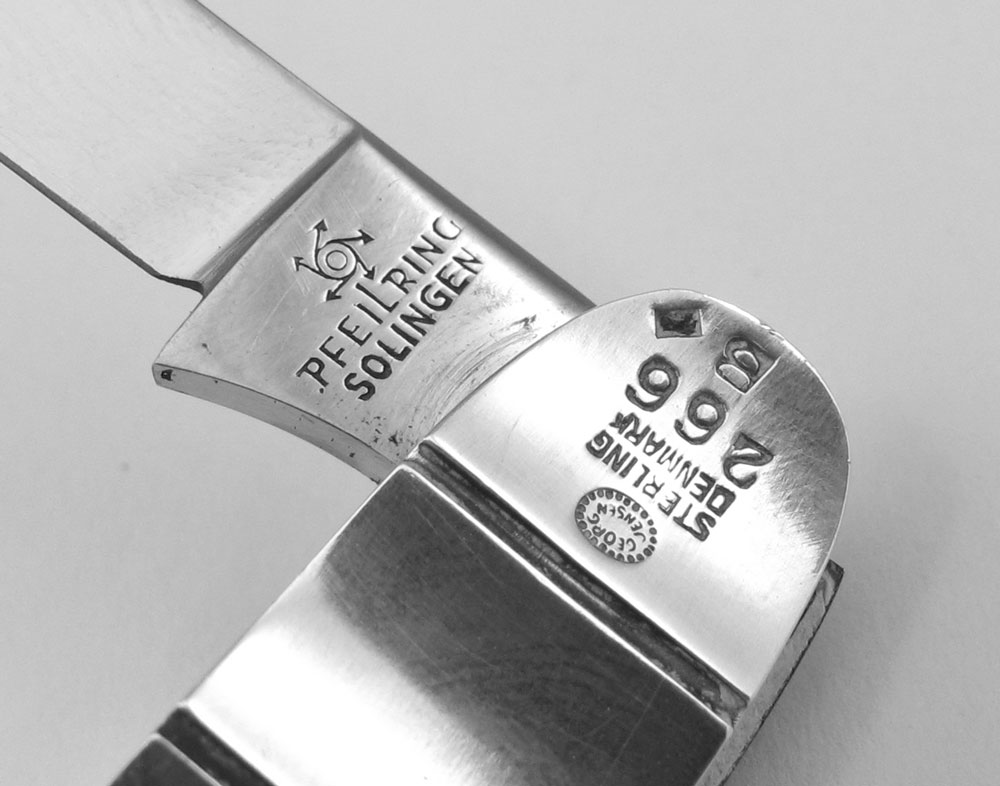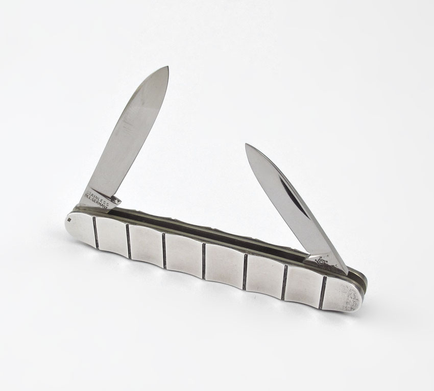 GEORG JENSEN STERLING SILVER LADIES FOLDING KNIFE: Diminutive folding knife with 2 blades, case made by Georg Jensen, marked with Current Jensen mark, Sterling, Denmark 266 B. Pfeilring blades. 6'' long fully opened. Sold with original box from Paris. Box 1'' h. x 4 1/2'' x 1 1/2''.