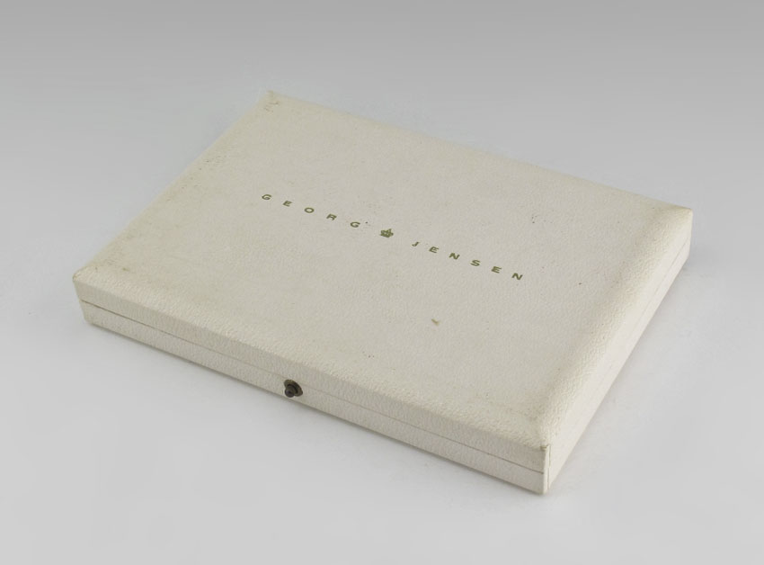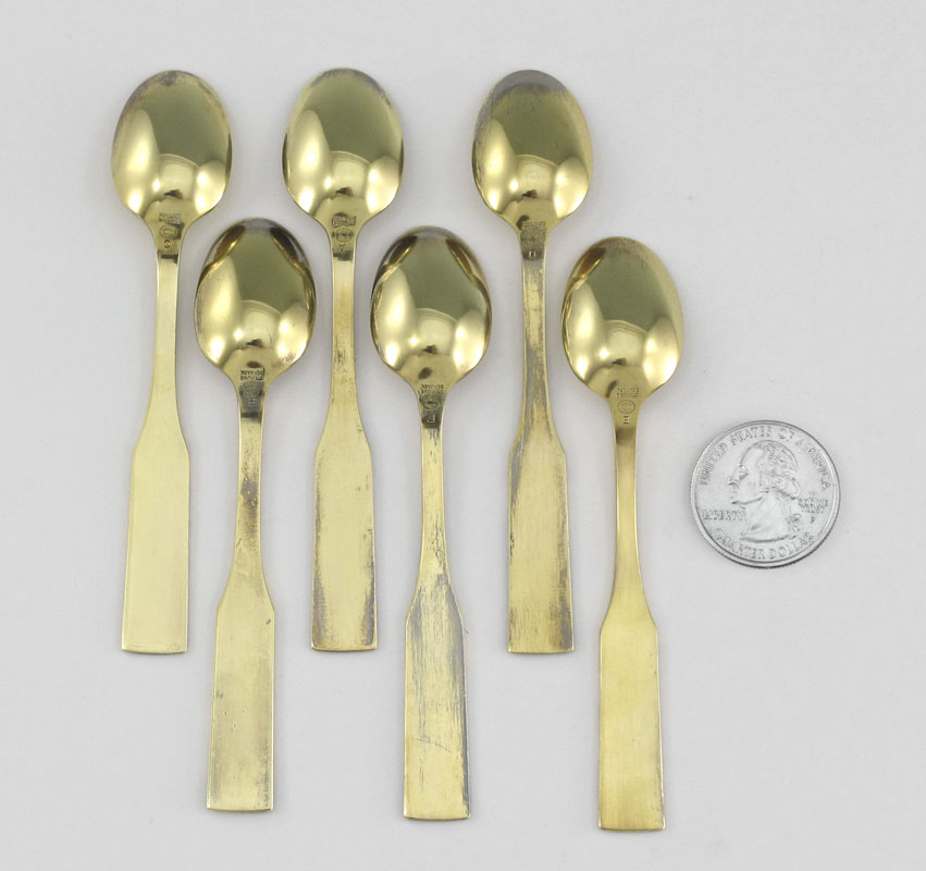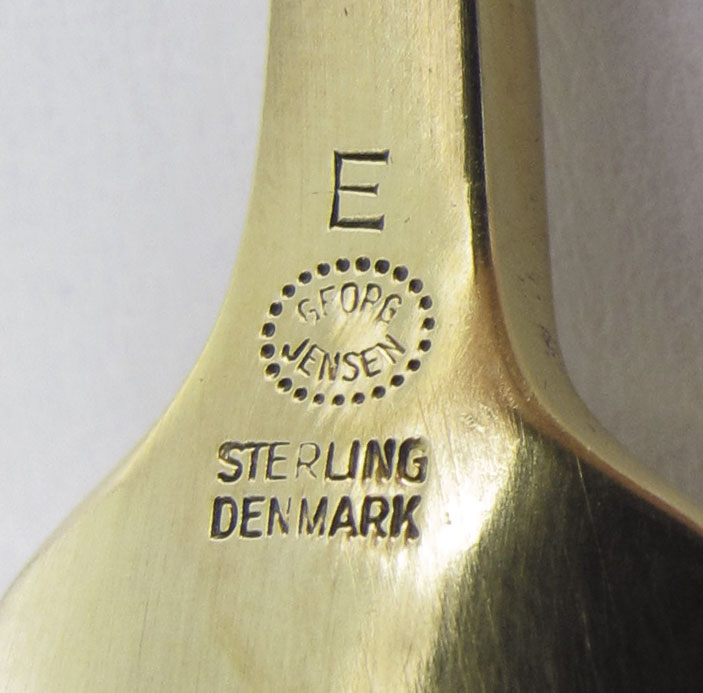 SET OF 6 GEORG JENSEN ENAMEL SPOONS: Set of 6 vermeil and multi-color enamel diamond pattern handles. Hallmarked Georg Jensen, Sterling Denmark C. Sold in original presentation case with push button clasp. Case 1 1/8'' h. x 7'' x 5''.