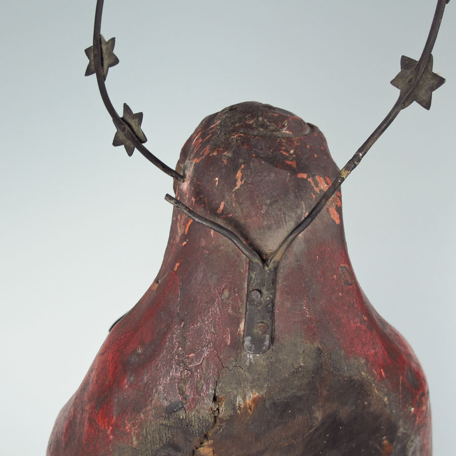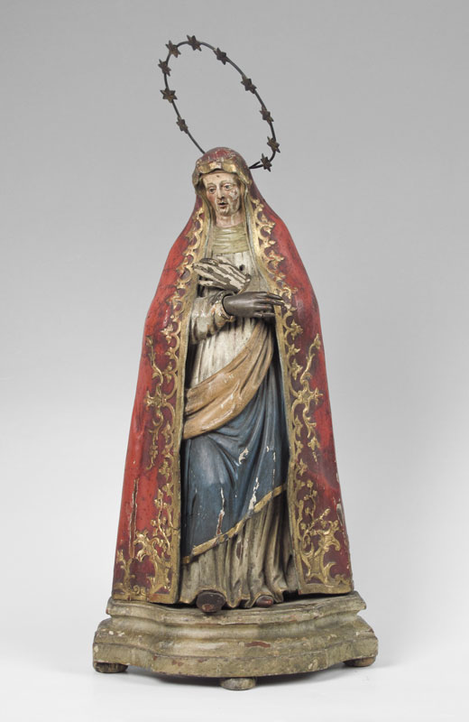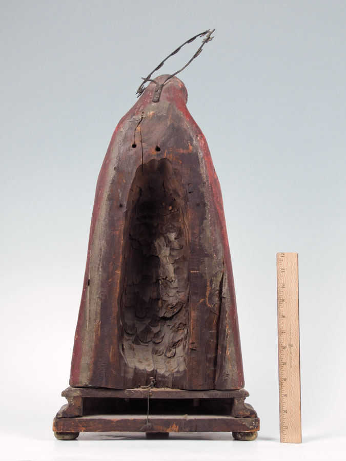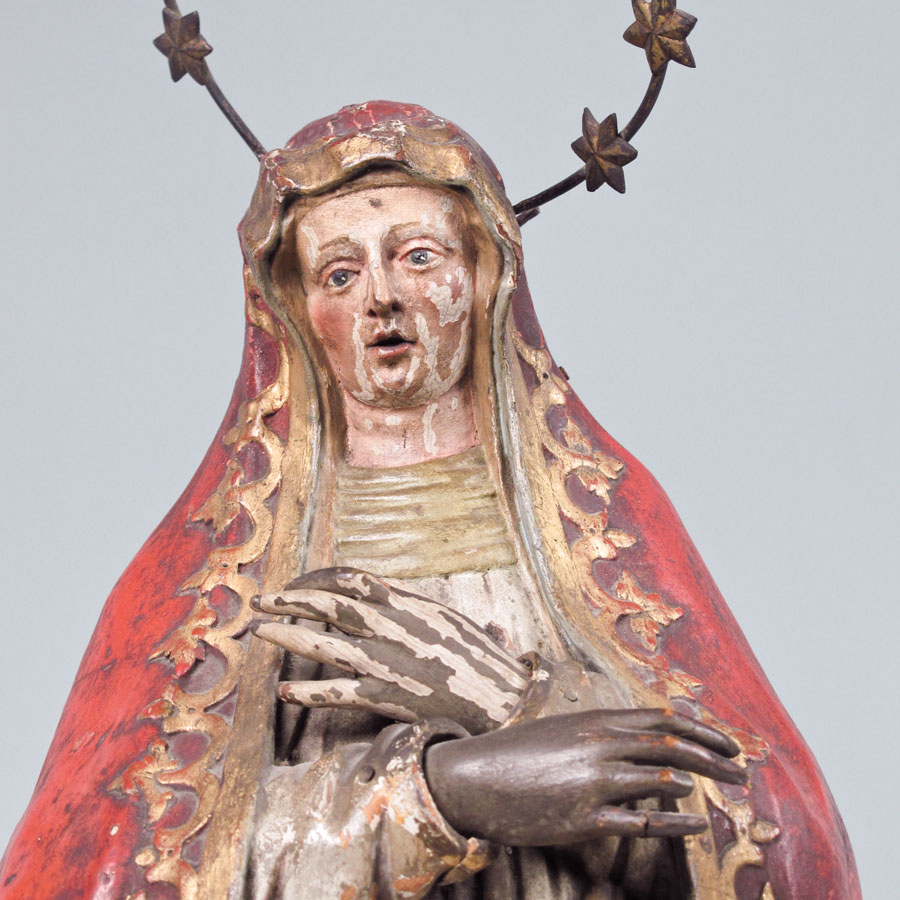 19th CENTURY CARVED SANTOS OF THE HOLY MOTHER: Carved wood Madonna with metal halo. Original polychrome and gold decoration. Some loss of paint, minor damage. 28'' x 13'' x 5''.