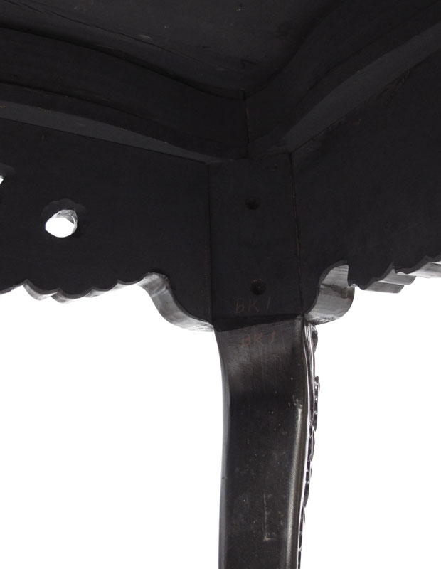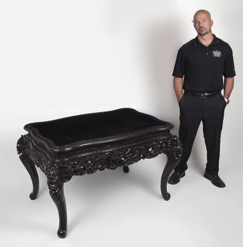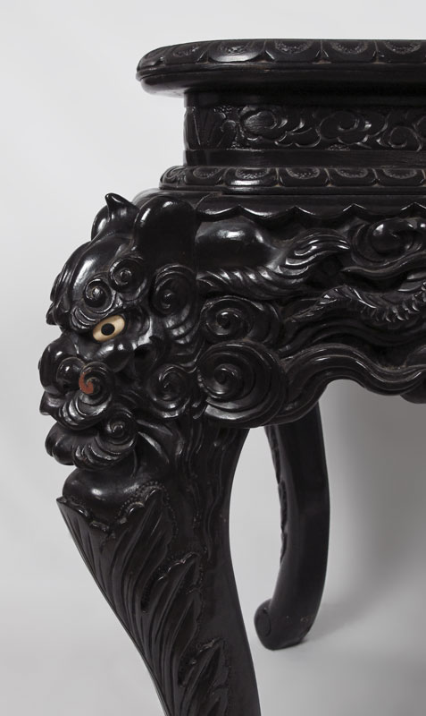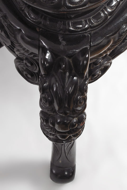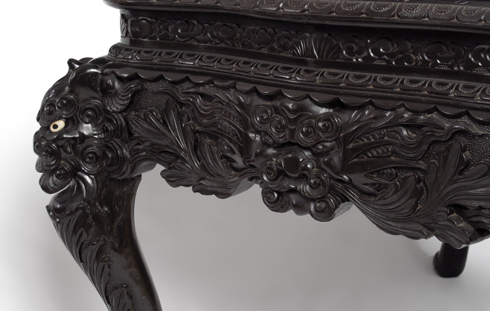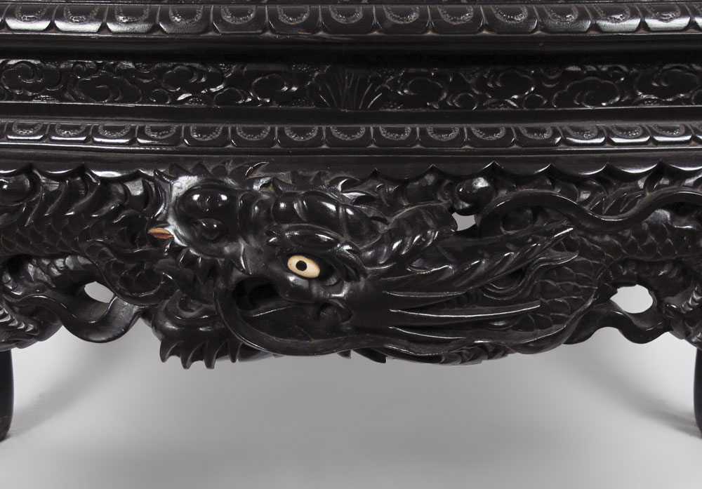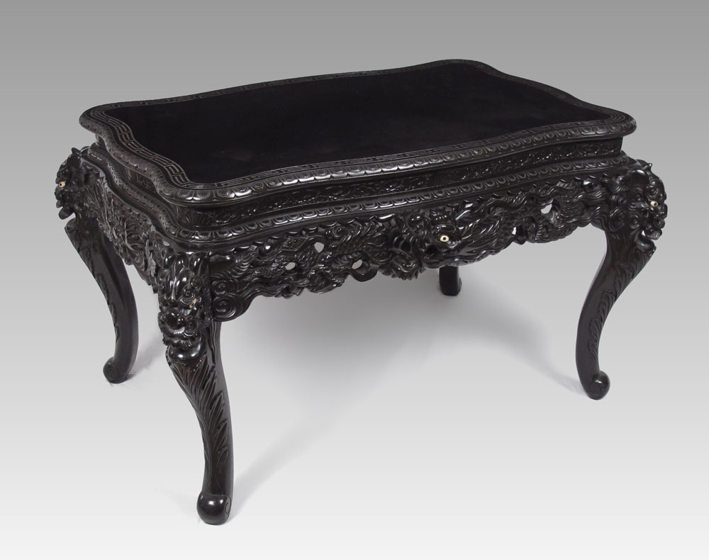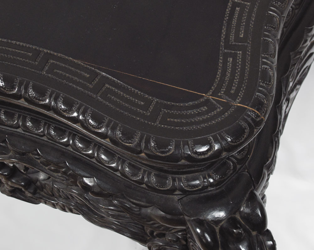 CARVED JAPANESE LACQUER CENTER TABLE: Profusely carved with dragons on apron, figural masqueron on leg joints, bone accents to eyes. Made in Japan label. Measures 37'' h. x 34'' x 51''.