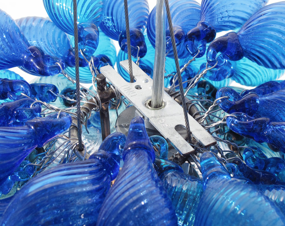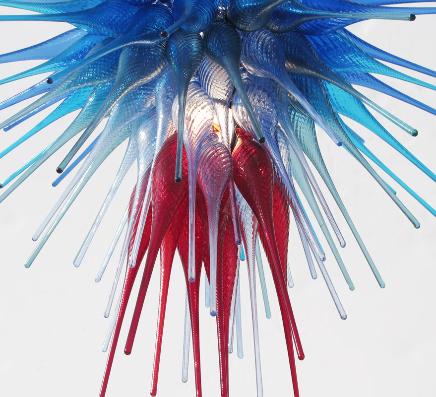 PENNEBAKER, Ed (American, 20TH C.): Red Fern Glass studio art glass chandelier by Ed Pennebaker. 5 color blown glass spikes over interior light source. The glass portion alone measures 16'' x 24''.