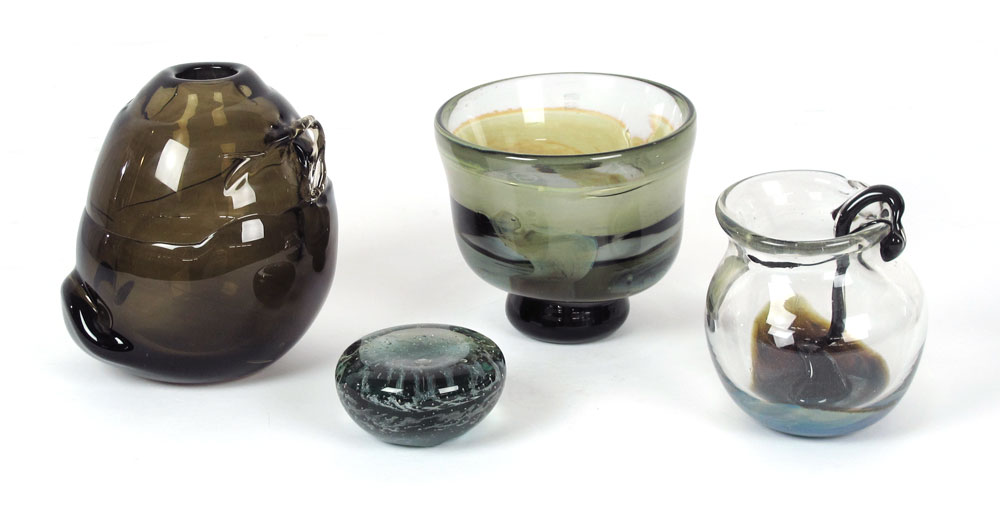 DEXTER, Will (American, 20th C): 4 piece group of blown art glass by Will Dexter, co-founder of Taylor Backs. His works are in the Philadelphia Museum of Fine Art, Corning Museum, National Museum of American History, Smithsonian, and many other public, private and corporate collections. All pieces are signed ''Dexter''. The largest piece measures 7 1/2'' tall, the smallest is the 3 1/2'' paperweight.