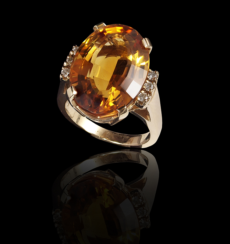 14.28 CT CITRINE RING: At the center of this 14K yellow gold ring is a strong color oval shaped mixed cut citrine of approx. 14.18 Ct., rated VVS in clarity, 3 tone and 3 saturation. 6 round brilliant diamonds add a bit of sparkle, .15 Ct, VS in clarity and H-I in color. Stones are bezel and prong set. Size 6.5. Weight 10.7 grams. Sold with current Atlanta Gemological GIA graduates appraisal for $2,000.