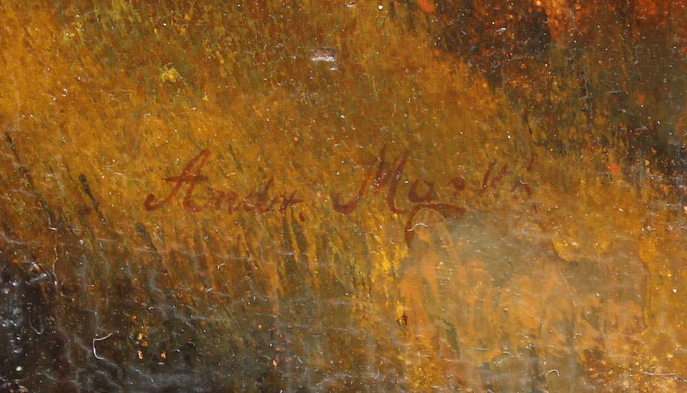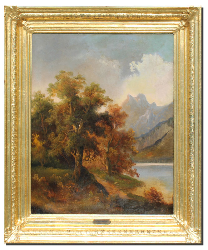 NINETEENTH CENTURY OIL ON CANVAS LANDSCAPE AFTER ANDRAS MARKO: 27'' x 21 5/8'', scene depicts a River Shoreline with Mountains in the Distance, spuriously signed lower left, encased in a regilded gesso frame with wear, 34'' x 29''.