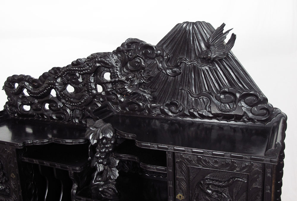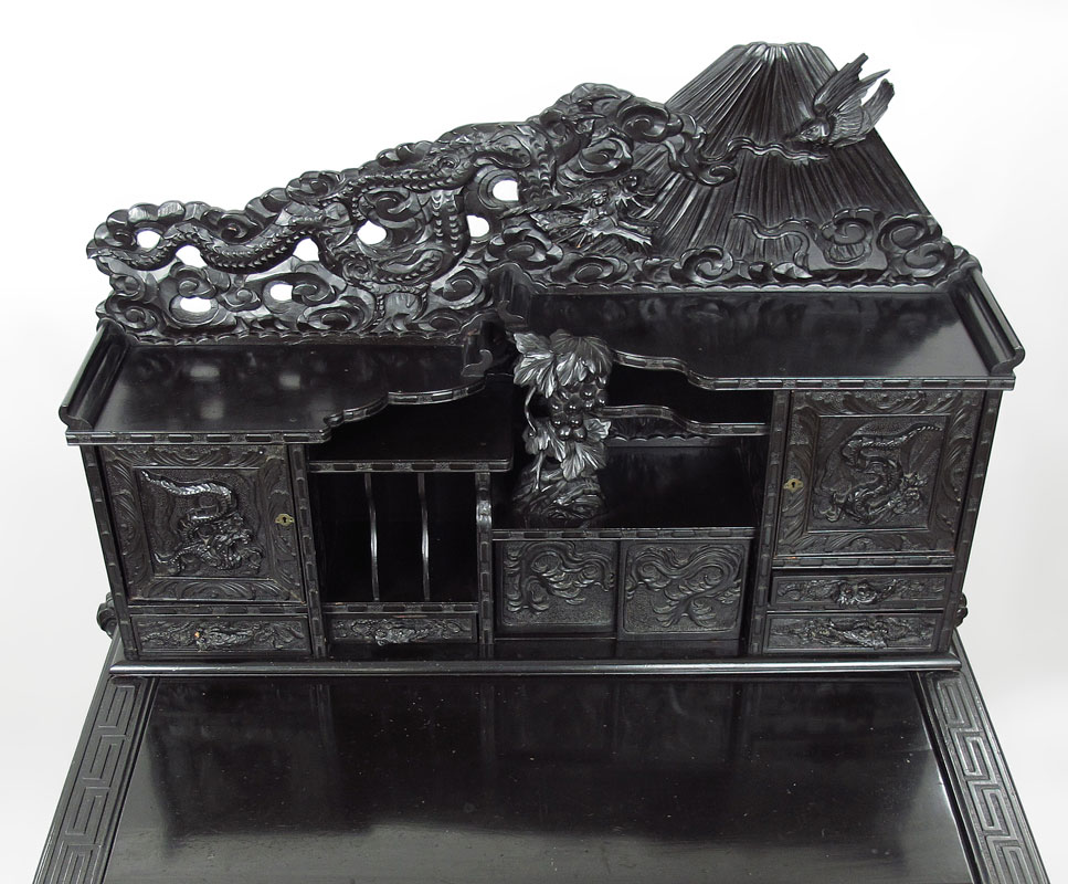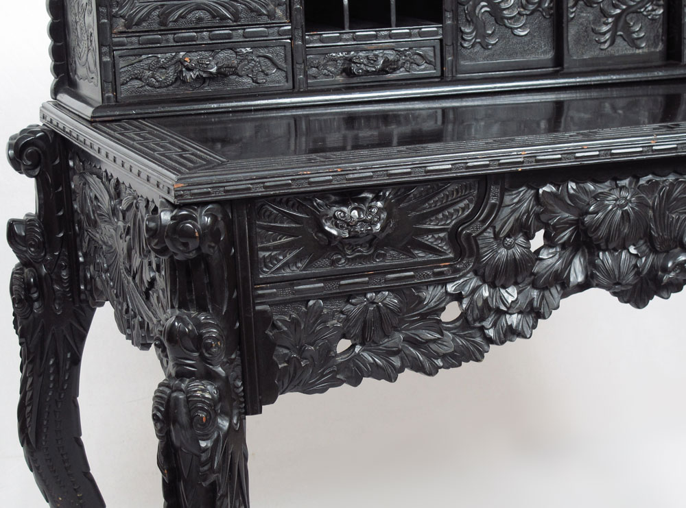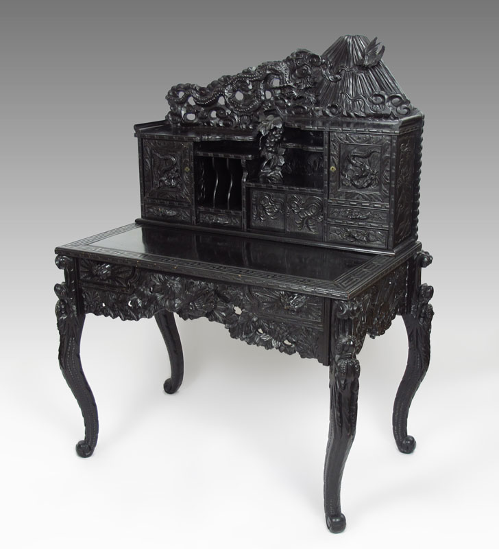 PROFUSELY CARVED CHINESE CARVED DESK: Carved crest with figural dragon, mountain and bird motif, over top section with shelves, carved panel doors and drawers of assorted sizes. Base with carved top, 2 drawers, carved and shaped skirt on 4 carved and shaped legs. Measures 57 3/4'' h. x 43'' x 22''.