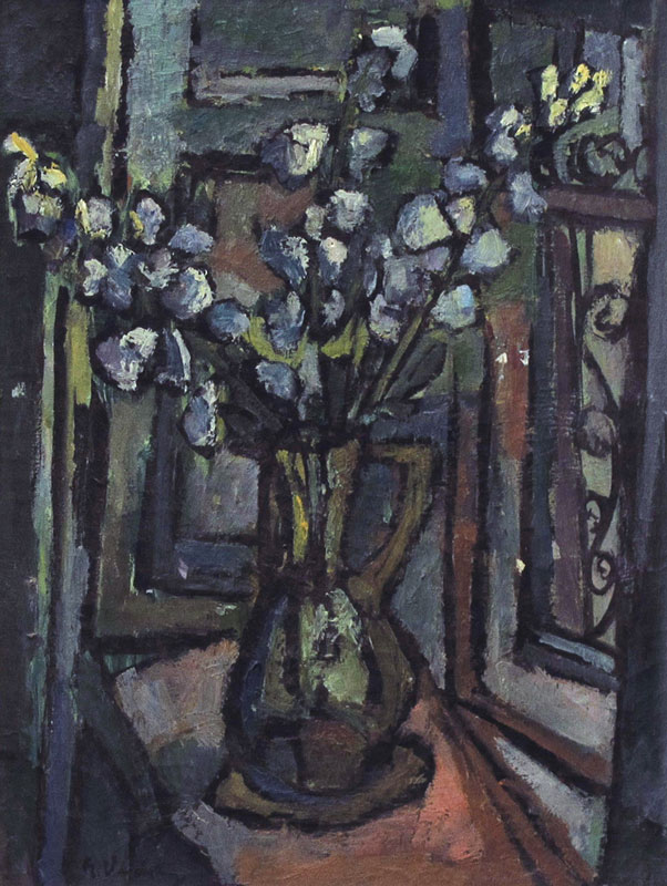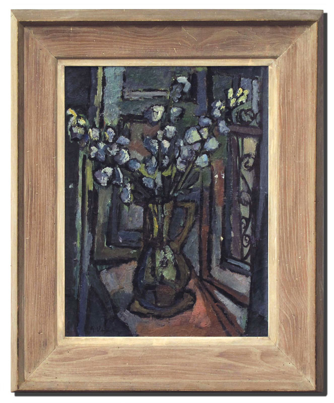 WENDING, Erwin, (American, 1900-1993): Modernist Tabletop Floral Still Life, Oil/Canvas, 26'' x 20'', signed lower left, period painted barnwood frame, 37'' x 30 1/2''. Born in Freiberg. In 1937, following the completion of his studies at the Dresden Art Academy, he immigrated to the Land of Israel. In 1939, he traveled to Paris to study at the Ecole des Beaux Arts. Following the German occupation in June 1940, he fled to London, where he received a grant to study at the St. Martin's School of Art. In 1947, he immigrated to New York. His works have been displayed in numerous exhibitions in England and the United States. (From Virtues of Memory, 6 decades of Holocaust Survivors' Creativity, website).