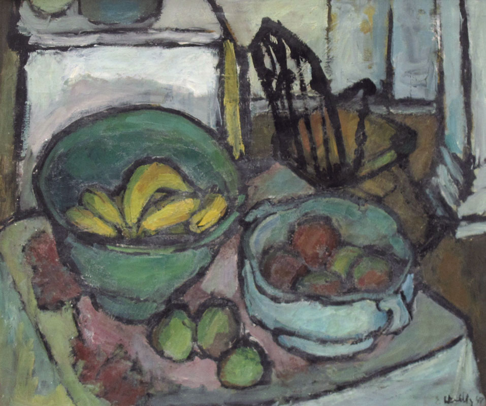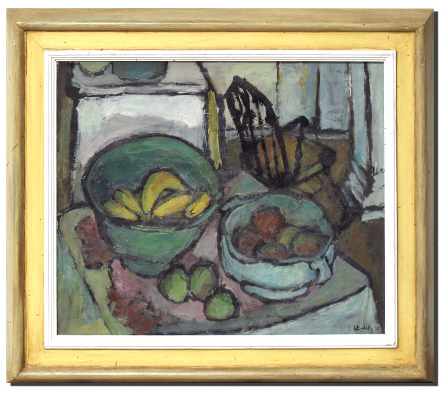 WENDING, Erwin, (American, 1900-1993): Modernist Tabletop Still Life with Fruit, Oil/Canvas, 20'' x 24'', signed lower right, dated '47, encased in a period painted frame with wear, 26 1/2'' x 31''.