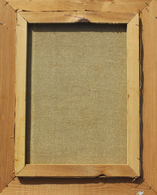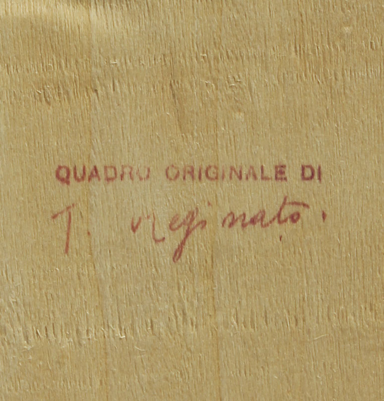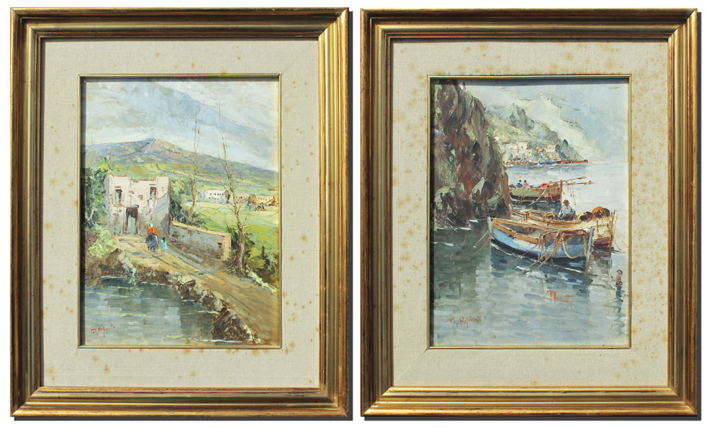 REGINATO, T., (Italian): Two Italian Landscapes; 1) Two Figures Traveling on a Path in a Landscape, Oil/Board, 15 3/4'' x 12'', signed lower left, also signed verso, encased in a gilded frame with minor wear, 23 1/2'' x 19 1/2''. 2) Italian Fishermen in Boats, Oil/Canvas, 15 3/4'' x 11 3/4'', signed lower left, gilded frame with wear, 24'' x 19''. 1) The mat does have foxing.