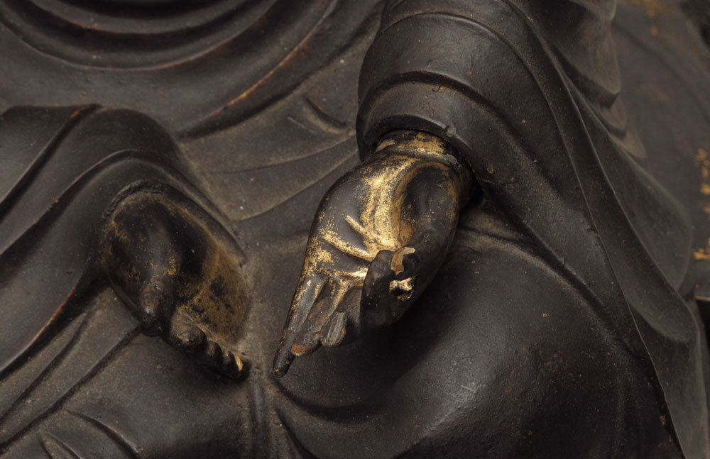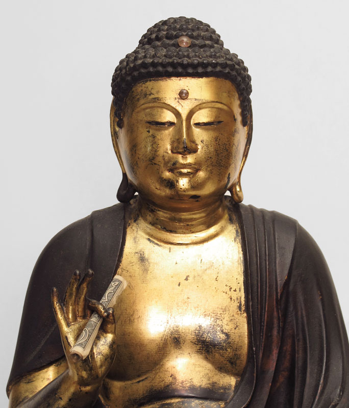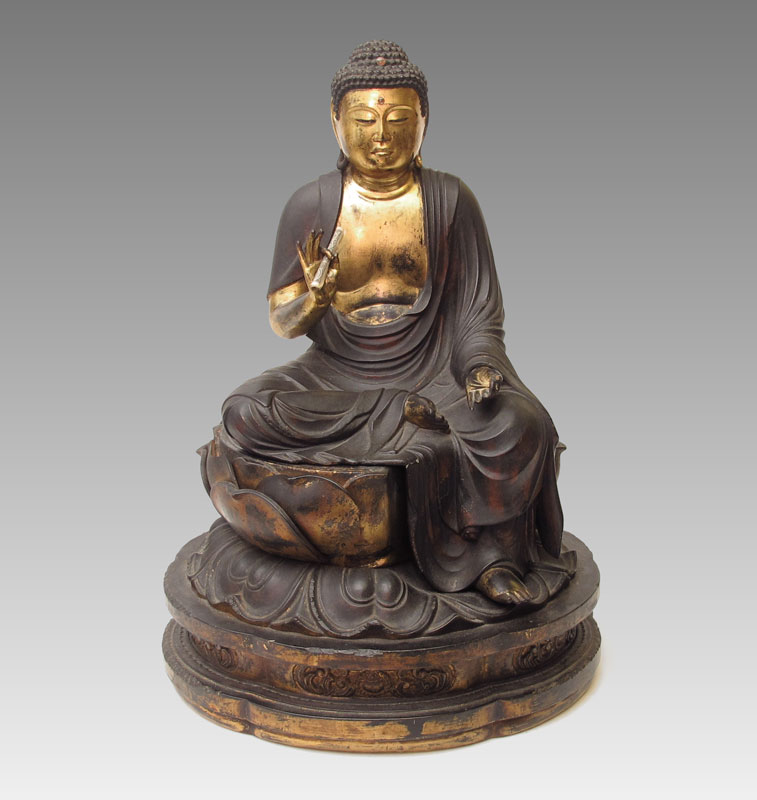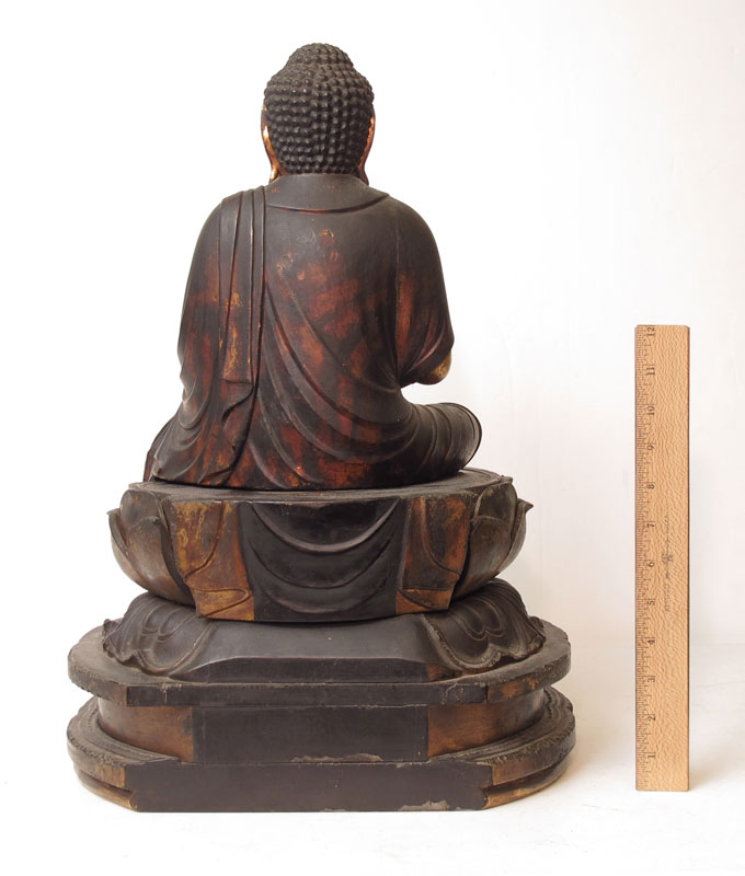 JAPANESE LACQUER AND GILT AMIDA BUDDHA: Buddha of infinite light. Two part lacquer and gilt Buddha on carved wood lotus flower base. Measures approx. 20'' tall x 14' x 13''. Age unknown.