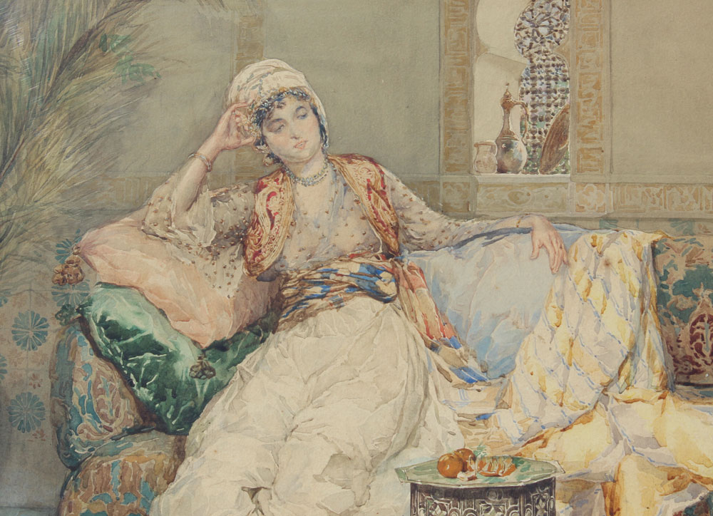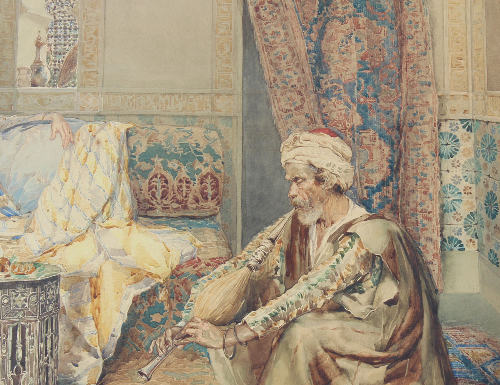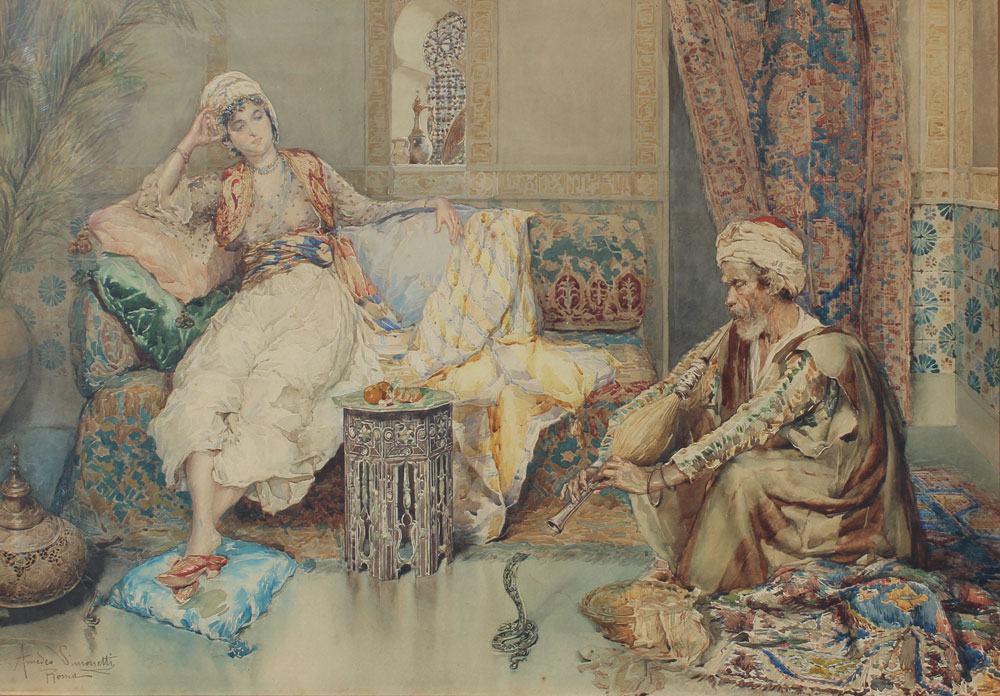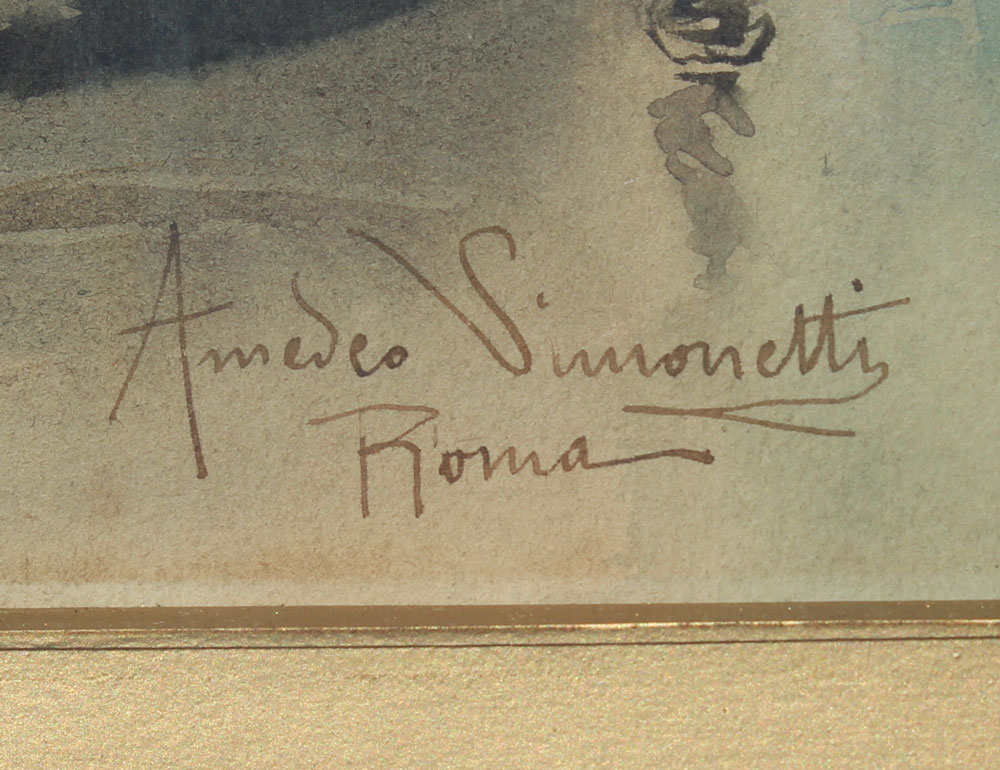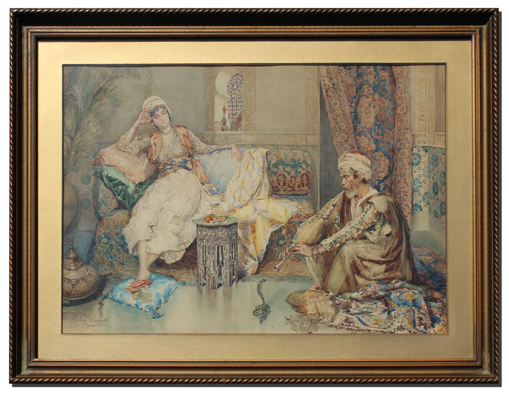 SIMONETTI, Amadeo, (Italian, 1872-1922): ''Snake Charmer'', Watercolor laid on cardboard, 15'' x 21 1/2'', signed lower left and marked Roma, titled on the R. Hasselgren Chicago label verso, carved and gilded frame with minor wear, 19 1/2'' x 27''. Member of The 25 of the Roman Campagna, studied at the Accademia di Bella Arti in Rome.