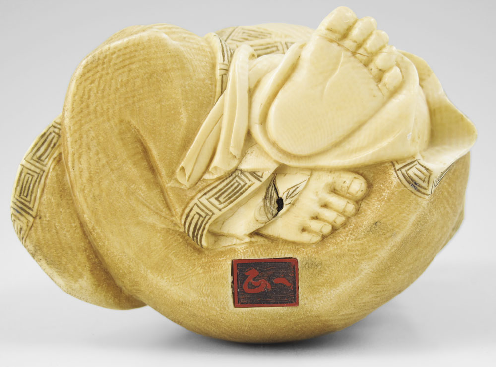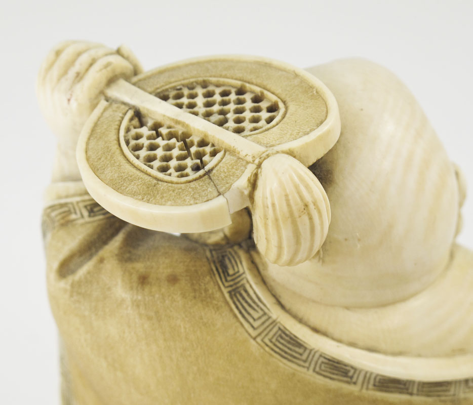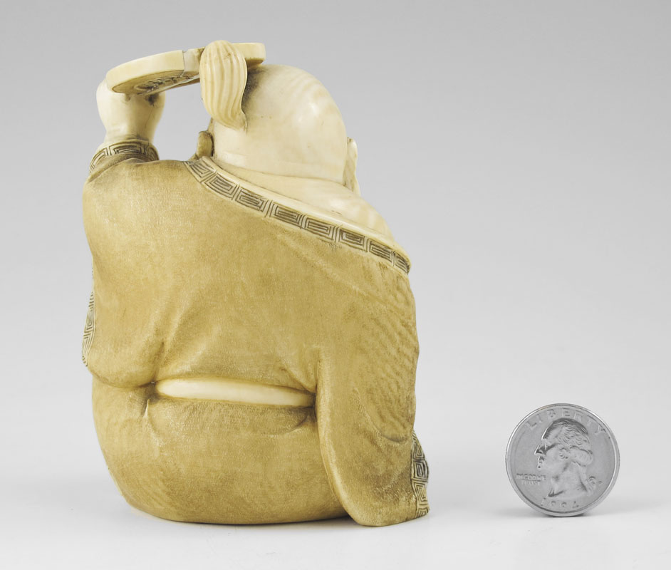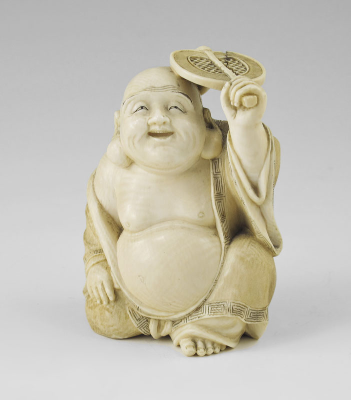 CARVED IVORY BUDDHA HOLDING FAN: Figure of squatting Buddha holding a fan over his head with left hand. Signed on base. Measures 4'' h. x 3''.