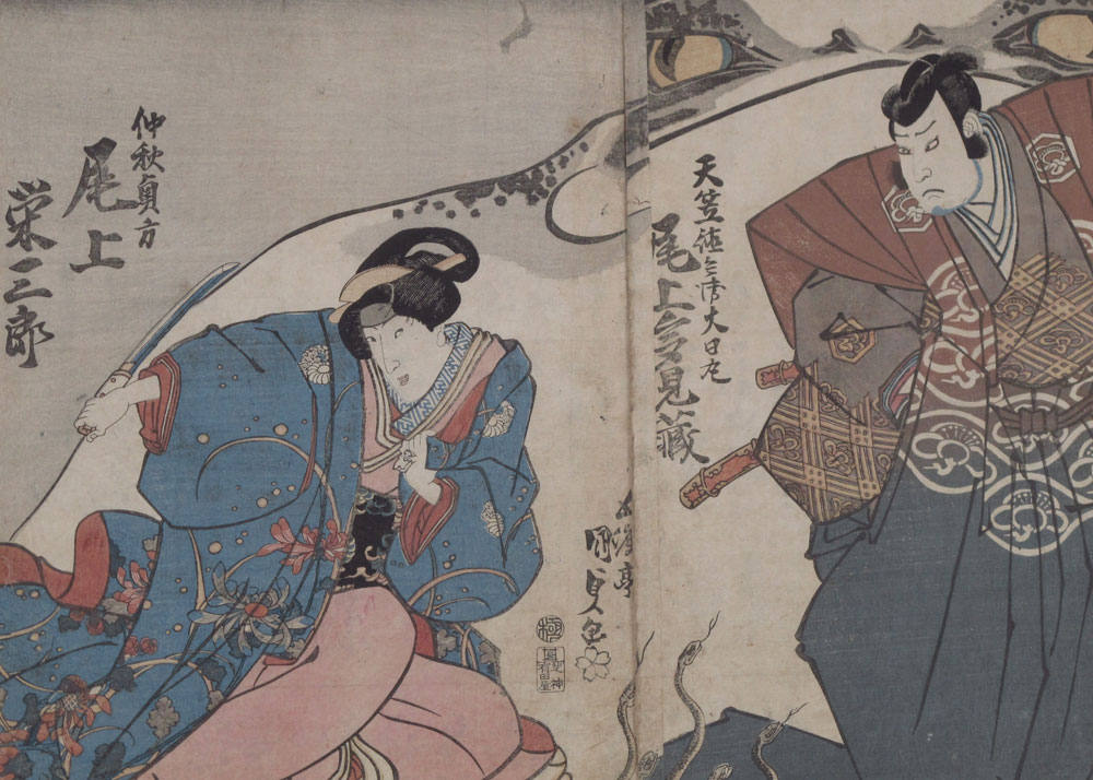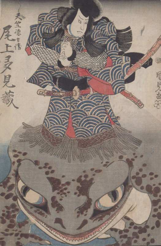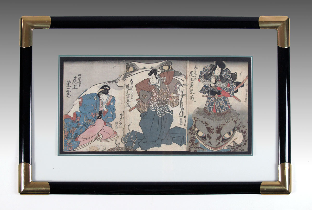 FRAMED TOGETHER ARE 3 JAPANESE KABUKI ACTOR PRINTS BY KUNIYOSHI: Two of the three prints join as a diptych, note the looming toad as a back drop. The third print also has a prominent toad. Framed together in black lacquer, under glass. 41'' x 27' overall.
