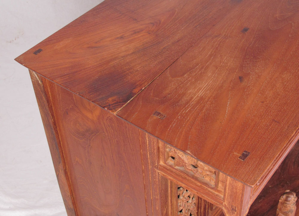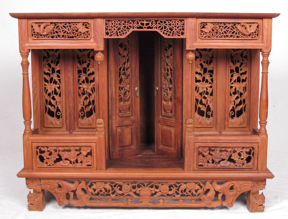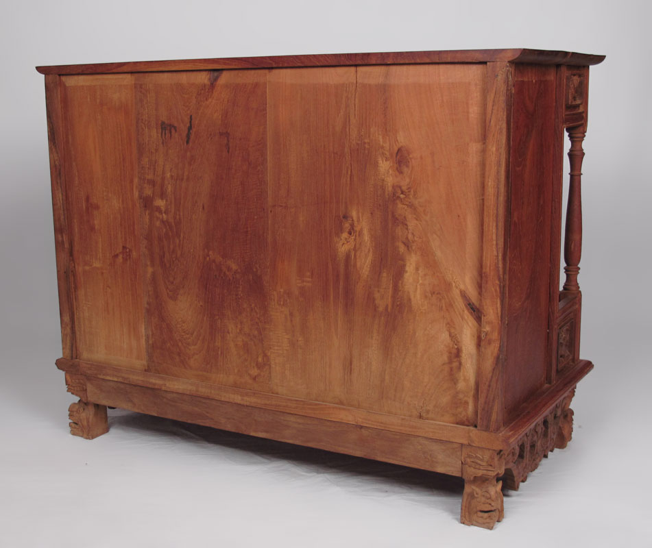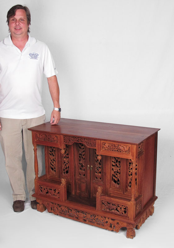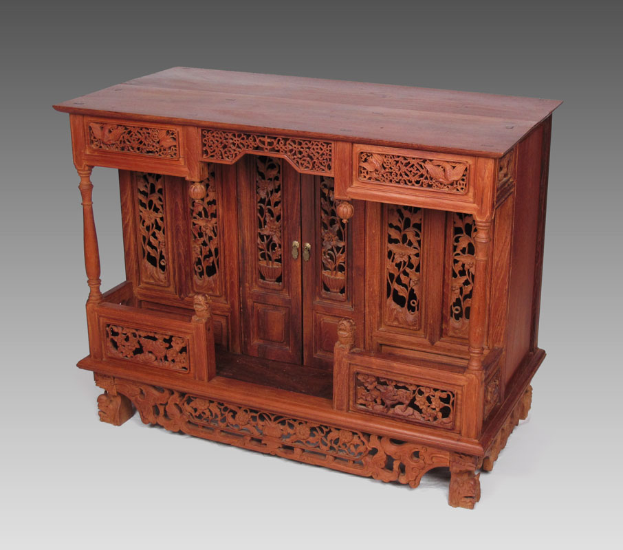 PROFUSELY CARVED TEAK ALTAR TABLE: Teak top with carved and pierced panels, recessed 2 central doors, carved feet and skirt, through tenon construction. 30'' h. x 38 1/2'' x 19 1/2''.