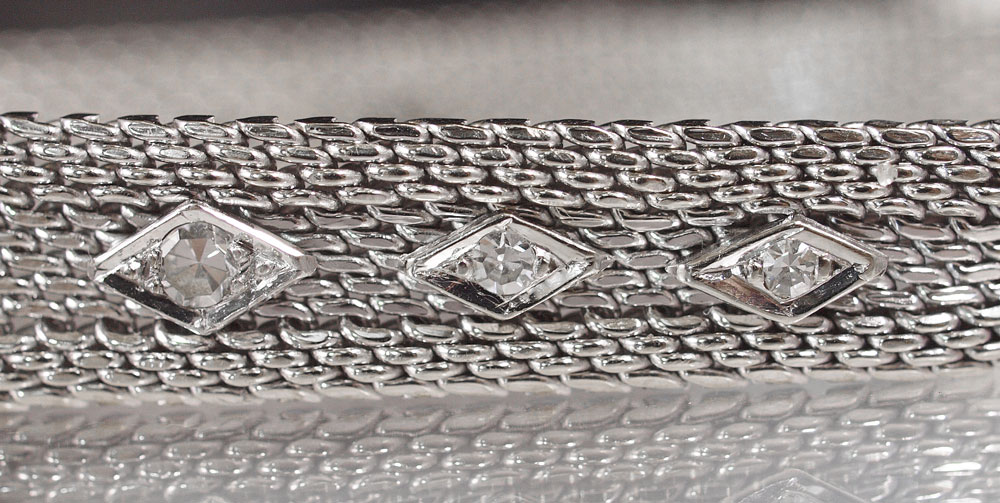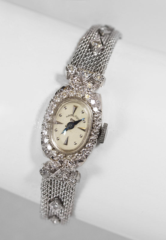 HAMILTON 14K GOLD & DIAMOND LADIES DRESS WATCH: CA. 1950's. 14k white gold case and mesh band on swivel hinges. Approximately 1 Ctw of bright diamonds ranging SI1-2 in clarity and color G-H-I. Mechanical 22 jewel movement by Hamilton USA, in running order. Approximately 18 grams weighed without crystal or movement.