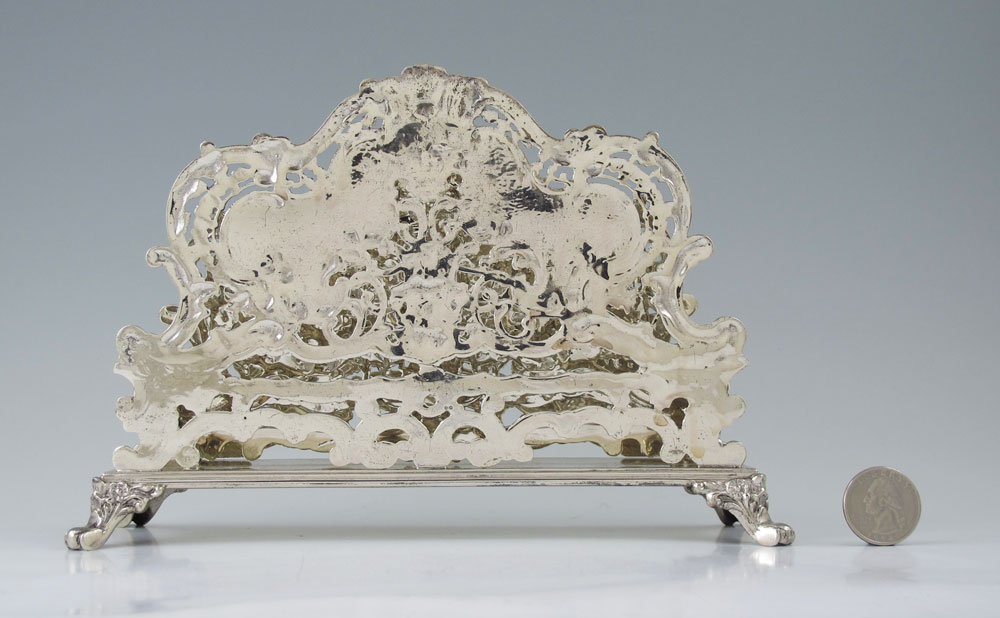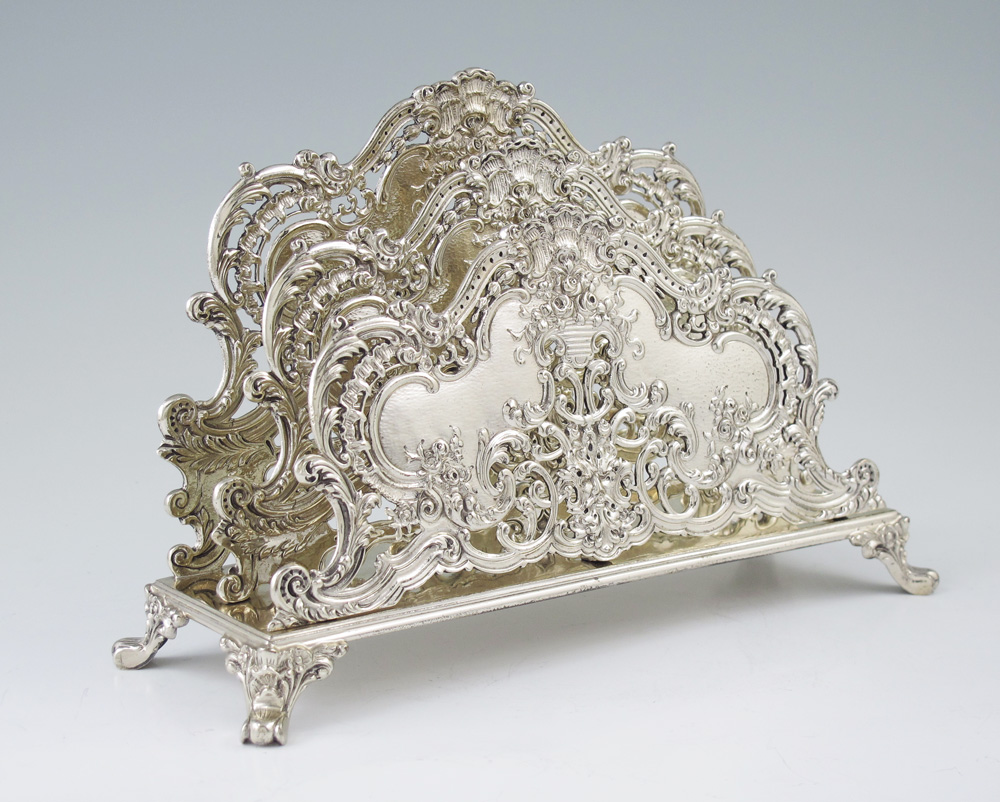 TUTTLE ART NOUVEAU STERLING LETTER RACK: Embossed and reticulated with North Wind face and foliate motifs, made for Shreve Crump & Low by Tuttle Silversmiths. Measures 5 7/8'' h. x 8 7/8'' x 3 1/4''. Approx. 21.5 troy oz.