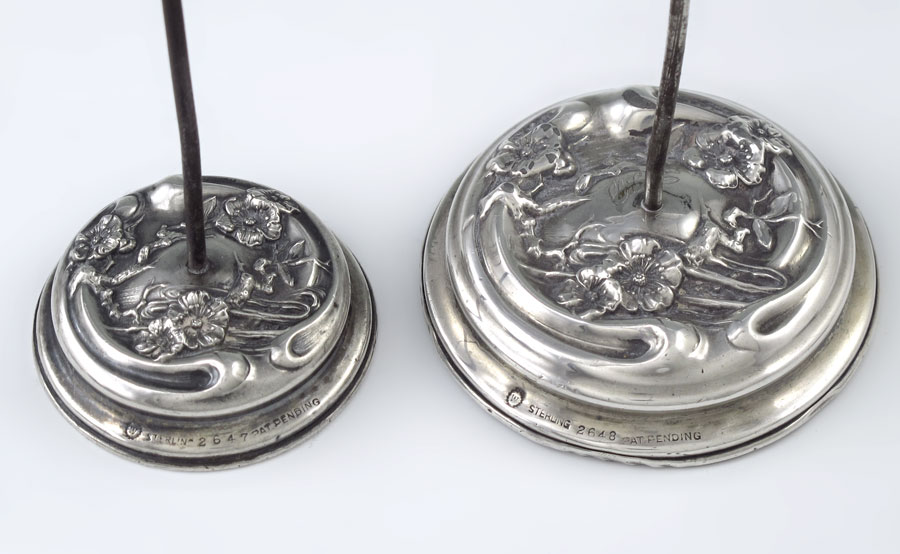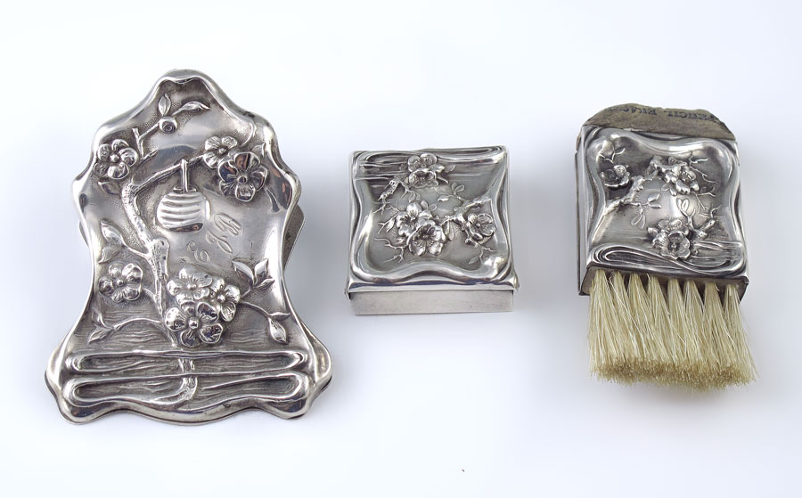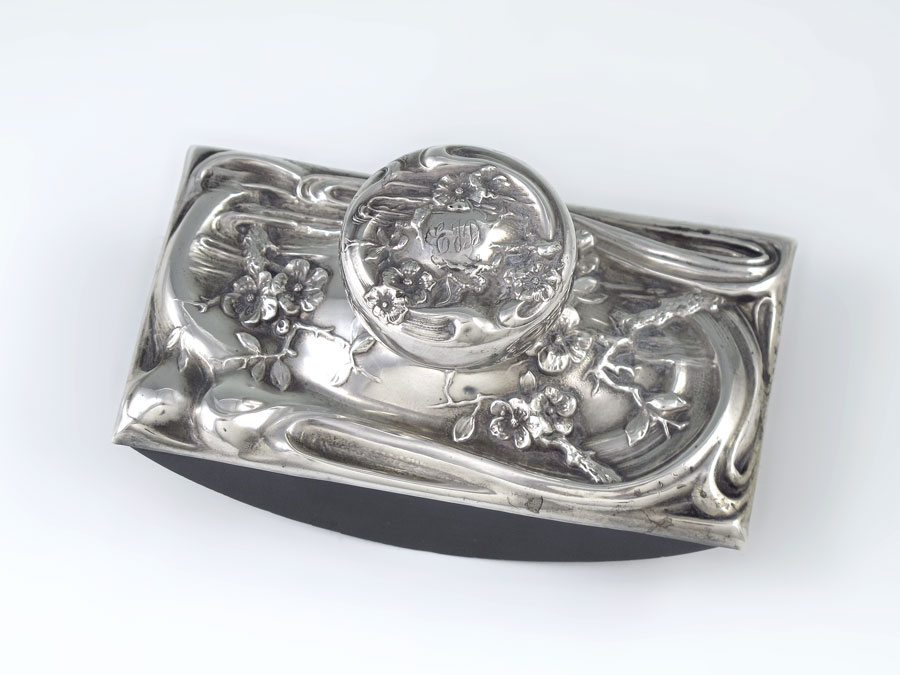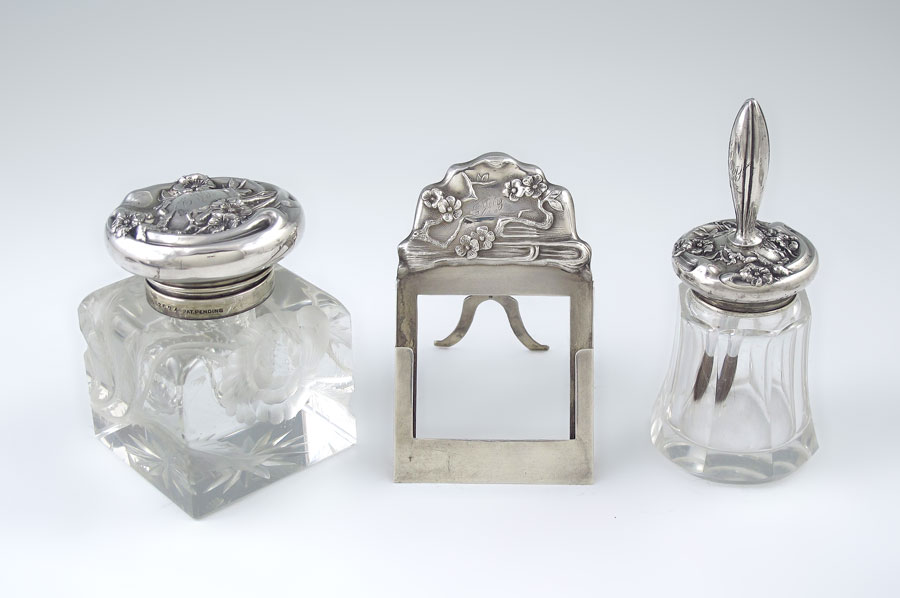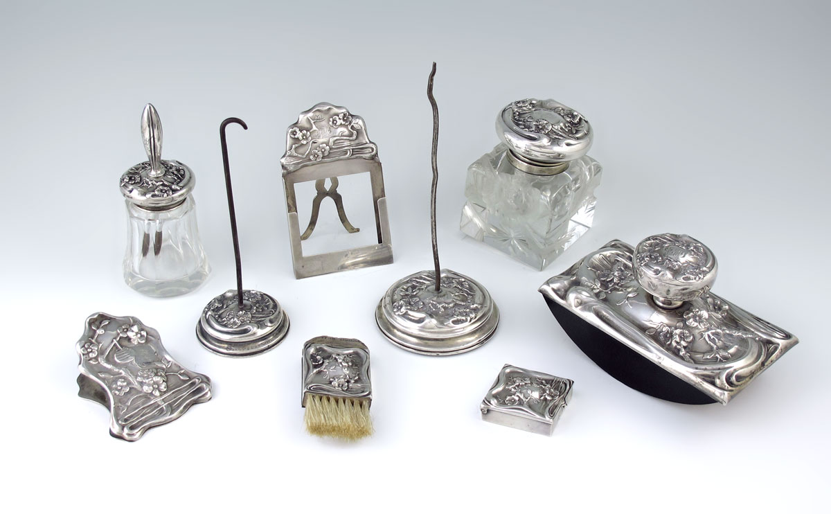 ART NOUVEAU WOODSIDE STERLING DESK SET: 9 pieces with Art Nouveau floral decoration to include blotter (2 3/4'' h. x 4 5/8'' x 2 1/2''), inkwell with cut glass body (3 1/4'' h. x 2 1/4'' square), desk clip (3'' h. x 2 1/4''), pair of weighted base spindles (larger 6'' h. x 2 5/8''), eraser with brush (2 3/4'' l.), calendar frame (3 3/4'' h. x 2 1/4''), stamp box (1 3/8'' x 1 1/2''), mucilage brush and crystal base (4 3/8'' h. x 2''). Most pieces monogrammed.