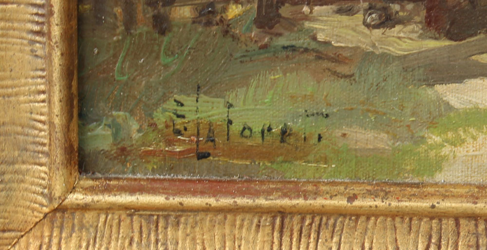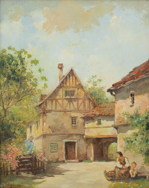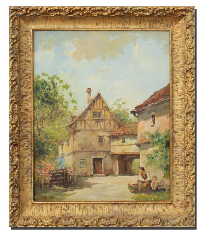 LA FORET, Eugene, (European, 19/20th C): Village Scene with Females Gossiping, Oil/Canvas, 20'' x 16'', gilded gesso frame with relief, 25'' x 21''.