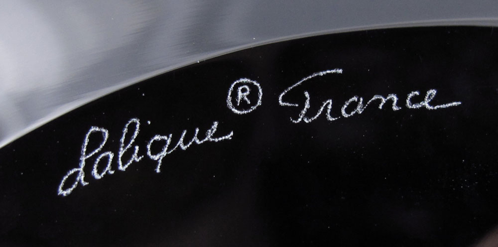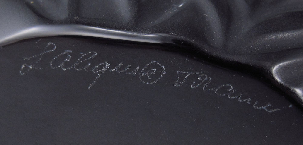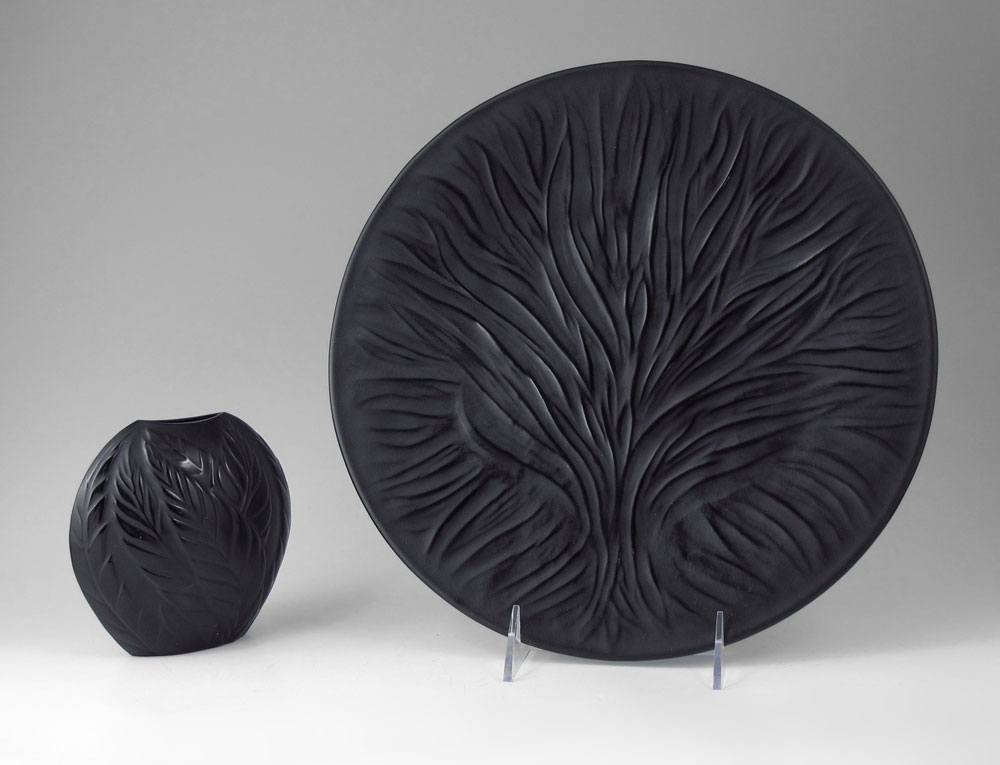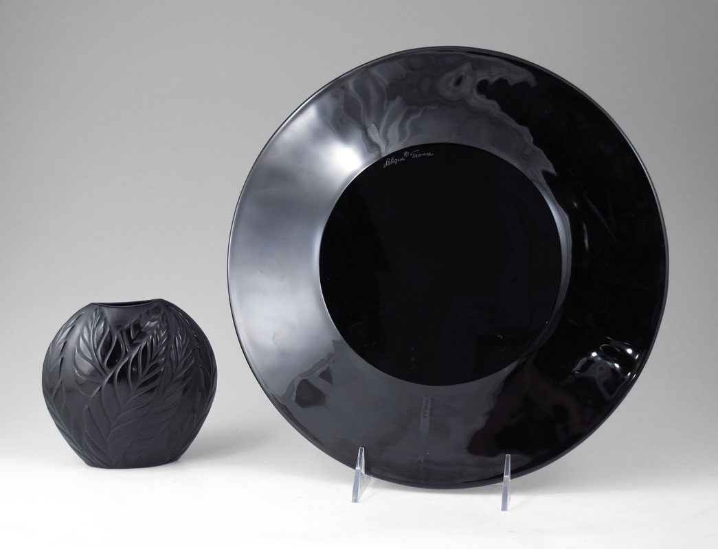 FRENCH LALIQUE BLACK CRYSTAL: Two piece group to include 1) ''Algues'' plate depicting flowing seaweed, 11.25''. 2) A pillow vase, 4.25'' tall x 4.5'' wide. Both pieces are signed.