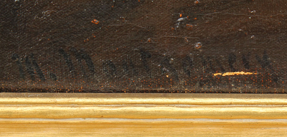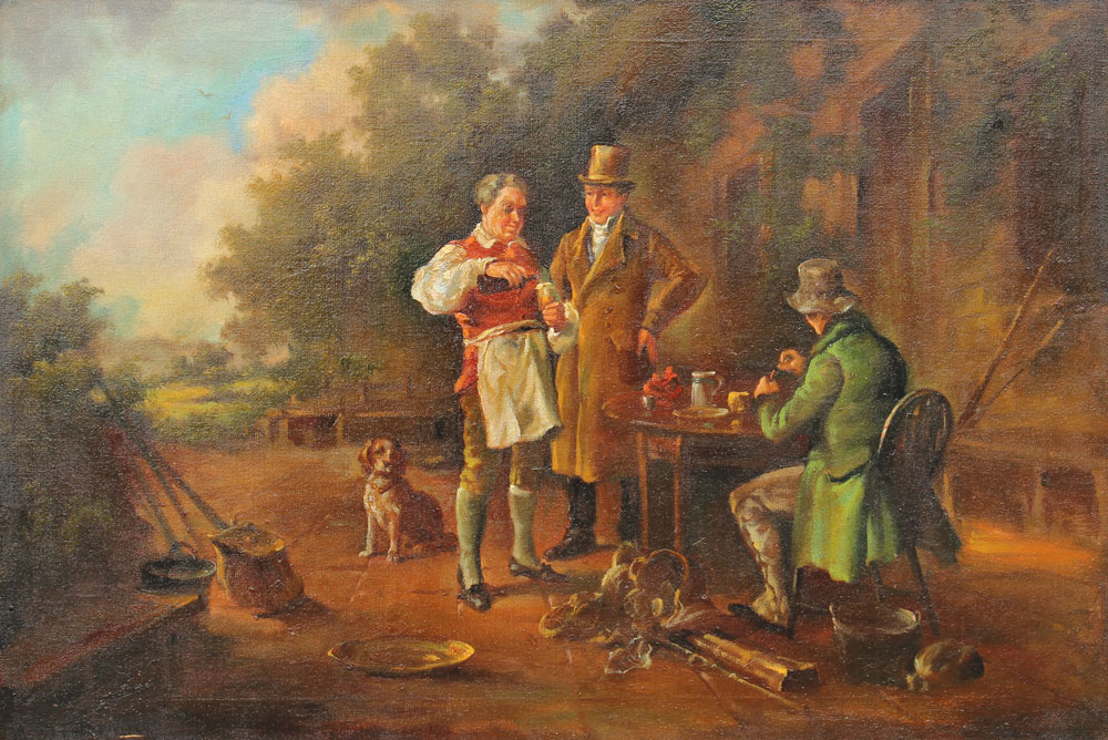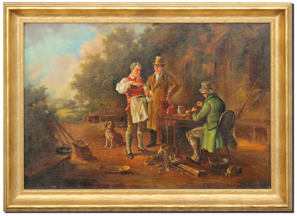 MONTGOMERY, (European, 19/20th C): A Feasting After the Hunt, Oil/Canvas, 24'' x 36'', signed lower left, encased in a gilded frame with wear, 30'' x 41 1/2''.