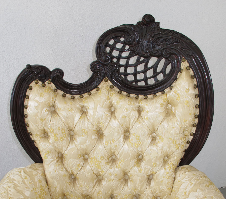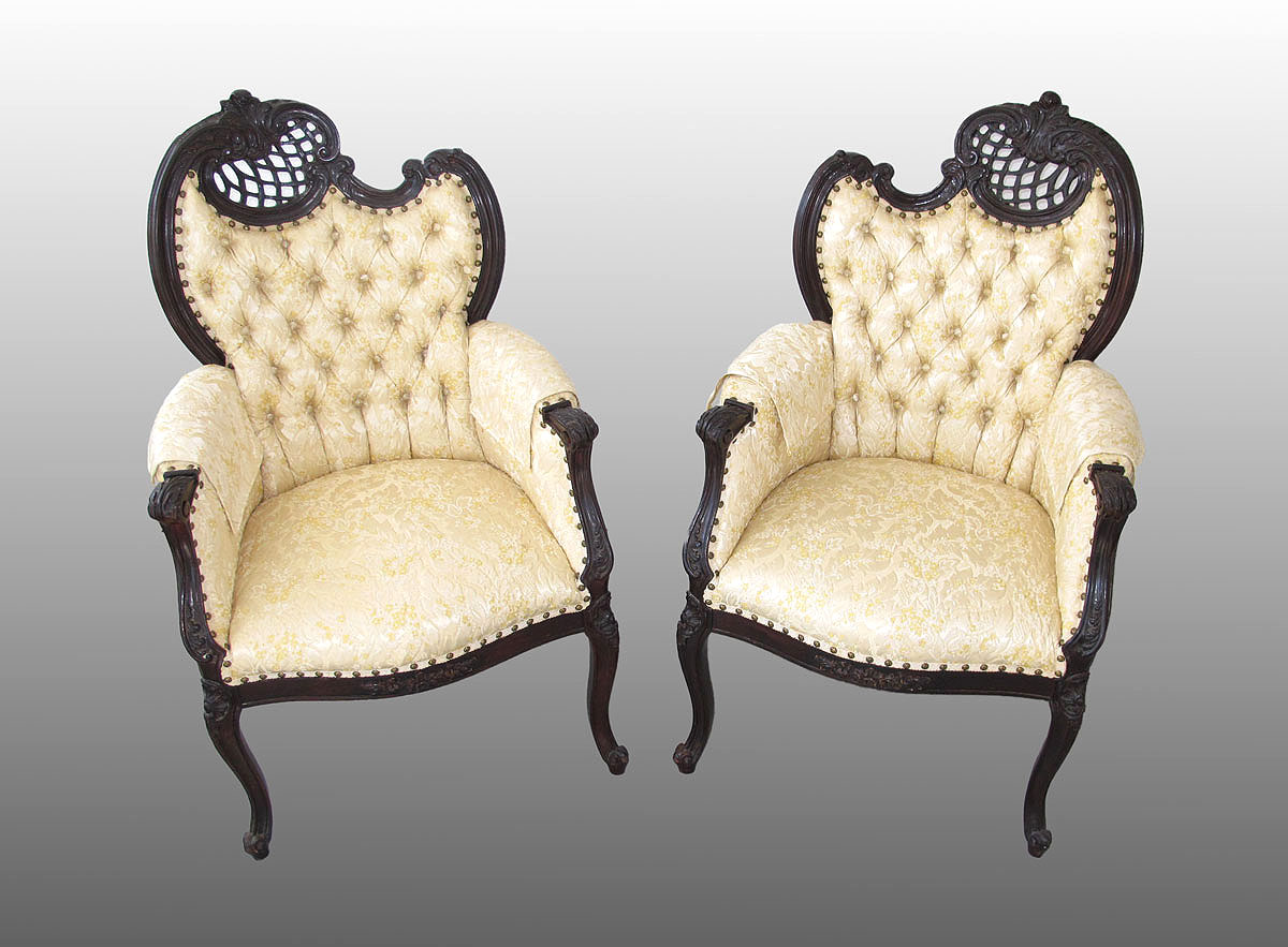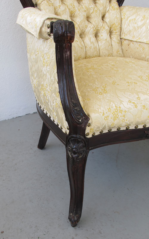 PAIR OF VICTORIAN BUTTON AND TUFTED PARLOR CHAIRS: Asymmetrical carved mahogany frames with pierce work crests. Tacked cream and yellow floral motif upholstery. Measures 42 1/2'' h. x 25 1/2'' x 26''.