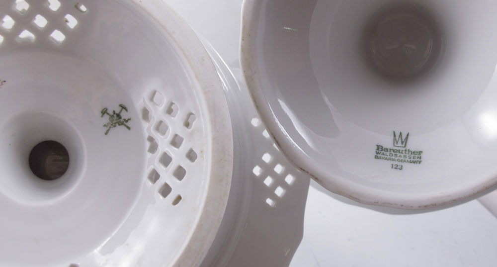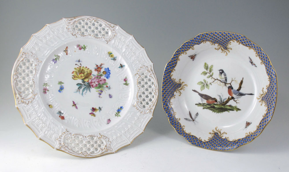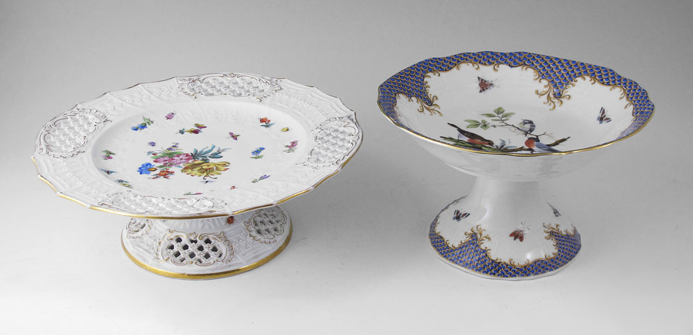 2 FINE GERMAN PORCELAIN COMPOTES: 1) Ca. 1910-1945 Fischer & Mieg reticulated and floral decorated stand, 9 1/2''dia. x 3 1/4''h. 2) Bayreuther bird and butterfly decorated compote, 4 3/4'' x 7 1/2'' dia.