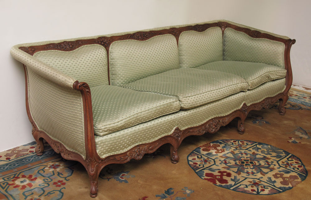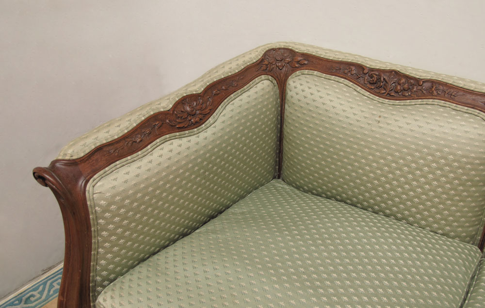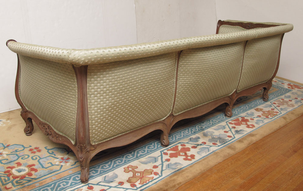 19TH CENTURY FRENCH CARVED SOFA: Heavily carved with floral and scroll motif back rail, arms, skirt and legs. Mint green upholstery with design. 30'' h. x 83 1/2'' x 33''.