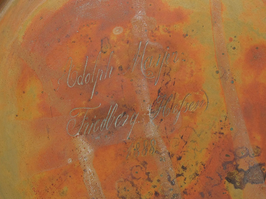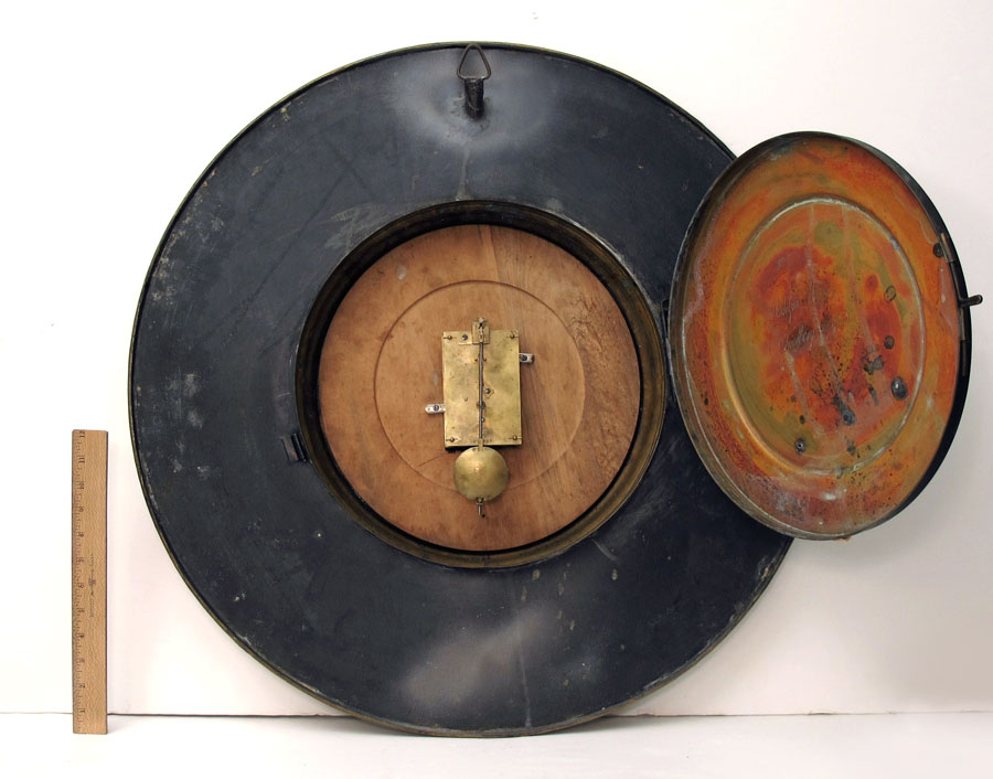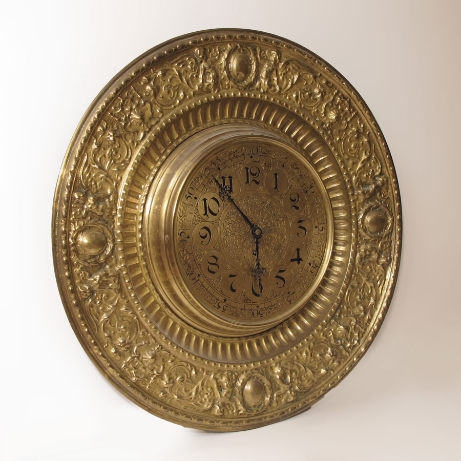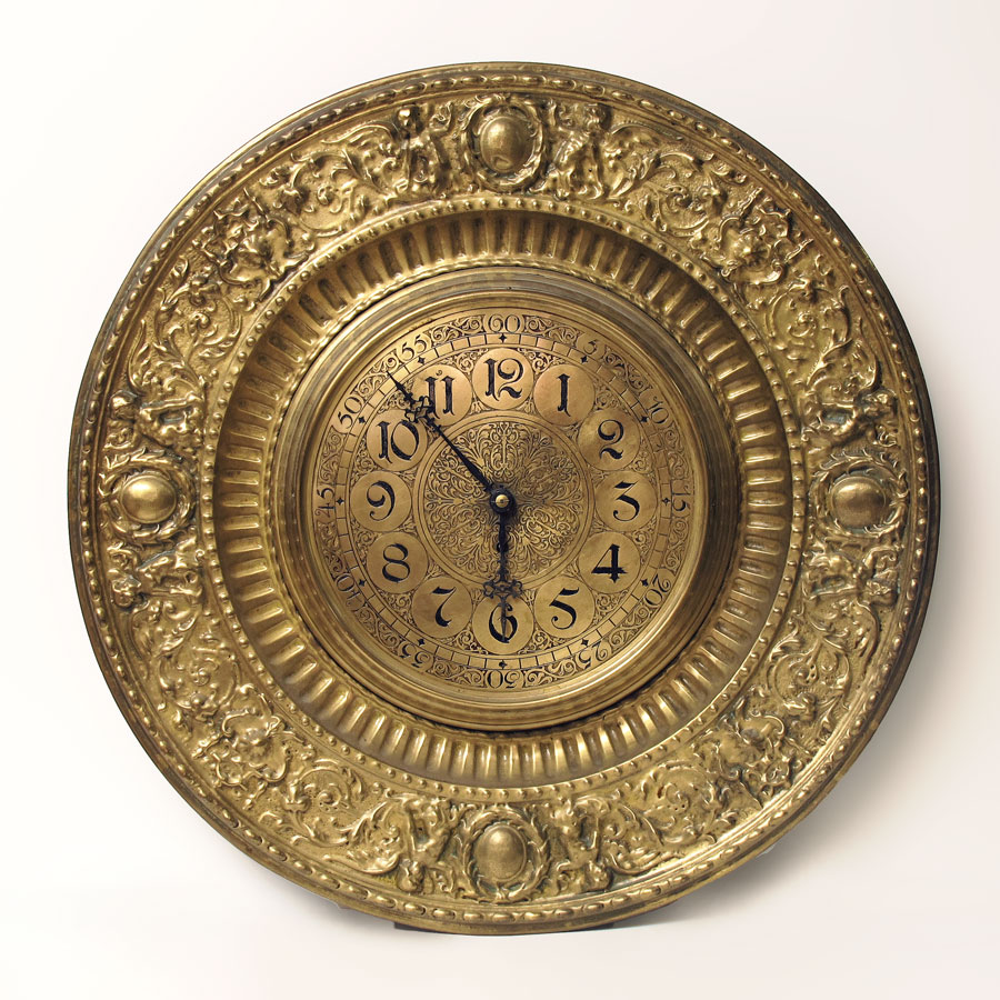1888 GERMAN BRASS PLATE EMBOSSED WALL CLOCK: Embossed frame featuring cherubs and foliate motif. Metal dial with Arabic numerals. Signed behind back plate Adolph Marjer?, Freidberg Hoefsen 1888. Lenzkirch movement. No key. Measures 28 1/4'' dia. x 4''.