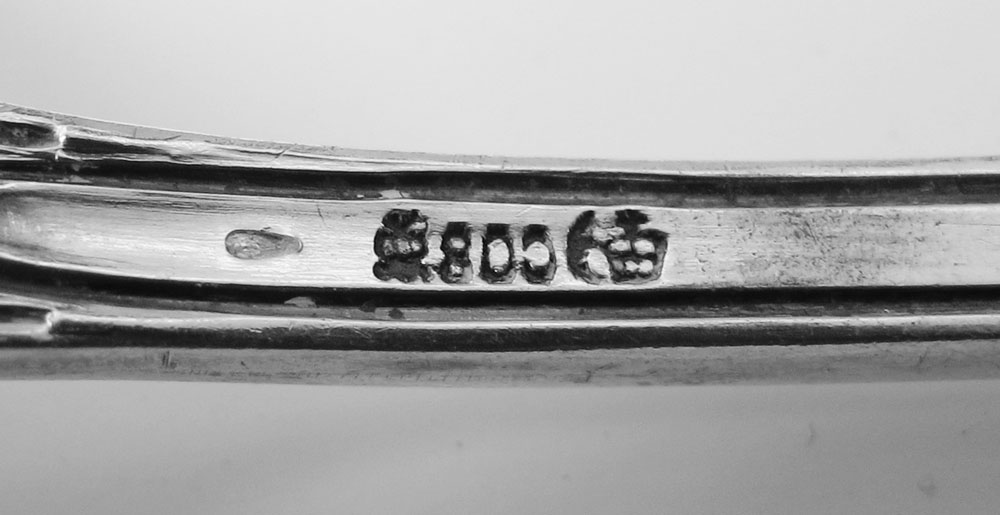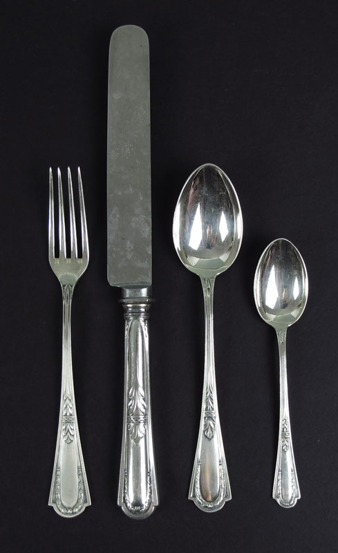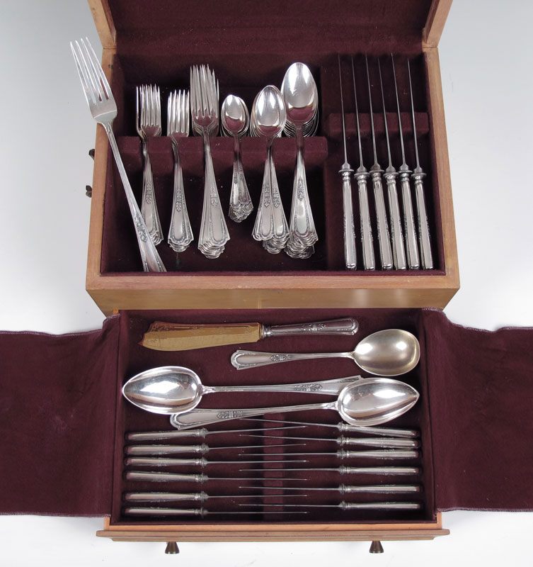 COLLECTION OF GERMAN 800 SILVER FLATWARE: Approx. 88 pieces Vereinigte Silberwarenfabriken German 800 silver to include 11 forks (8 1/2''), 12 salad forks (7 1/8''), 12 teaspoons (7''), 12 tablespoons (8 3/8''), 12 demitasse spoons (5 1/2''), 12 hollow knives (10 1/8''), 12 hollow butter knives (8 1/4''), vermeil blade hollow fish knife (10 1/4''), 2 serving spoons (11''), serving spoon (8 5/8''), serving fork (11''). Sold with silver chest, 7'' h. x 15 1/4'' x 12''. Approx. 116.6 troy oz.