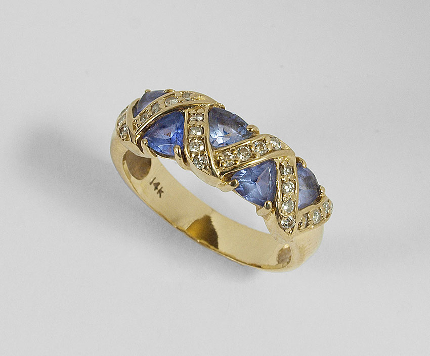 14K TANZANITE & DIAMOND RING: 14K yellow gold ring contains 5 triangle cut tanzanite. Weight: 1.00 Ct. Approx. 24 round brilliant cut diamonds. Weight: .25 Ct. Approx. Rated VS in clarity and H-I in color. Tanzanite and diamonds are prong set. Weight: 4.8 grams. Size: 7.5