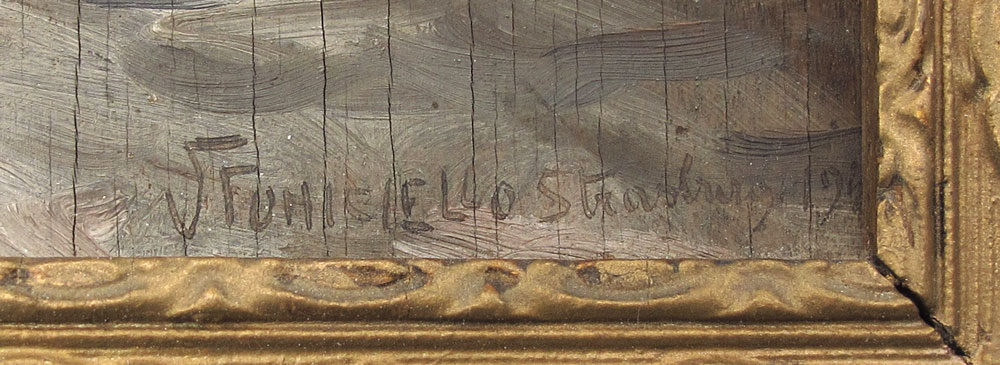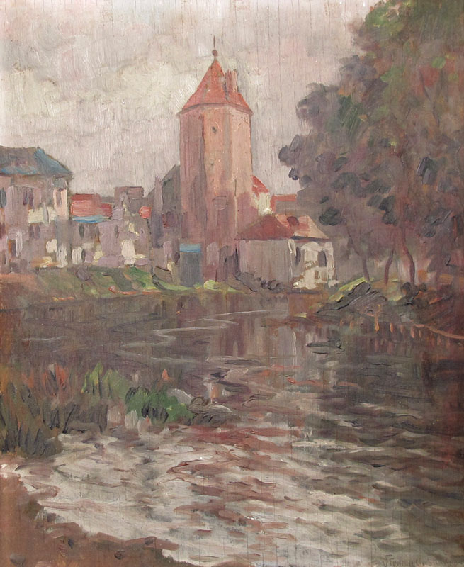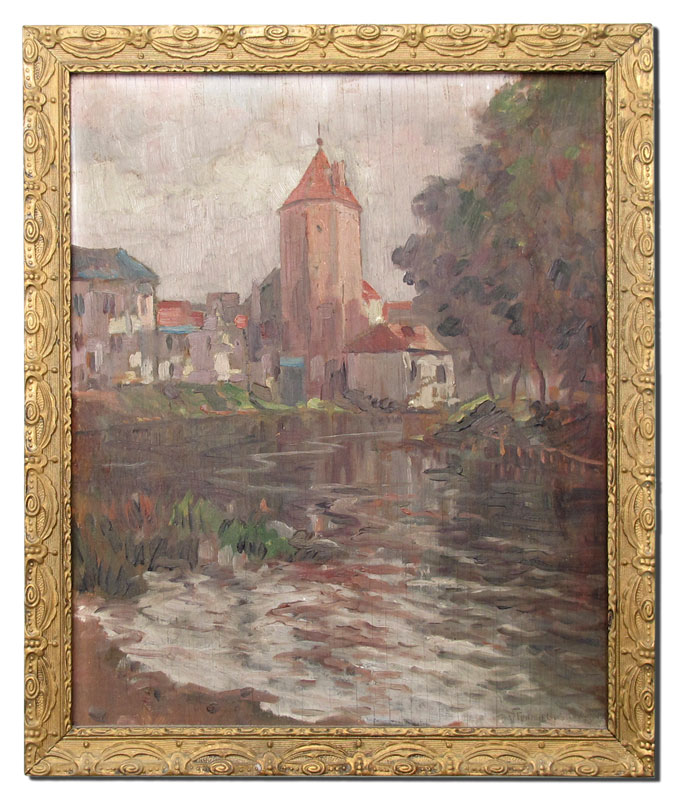 FUNICIELLO, Vincenzo, (Italian, 20th C.): River Scene, Strasburg, Oil/Board, 15'' x 12 1/4'', signed lower right, titled and dated 1943, gilded frame with overpaint, 16 1/2'' x 14''.