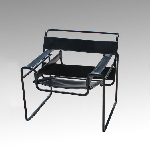 WASSILY CHAIR DESIGNED BY MARCEL BREUER: Black metal tube construction with black leather supports. 30'' h. x 30 1/4'' x 28''.