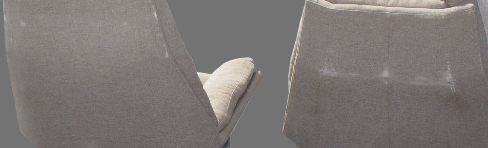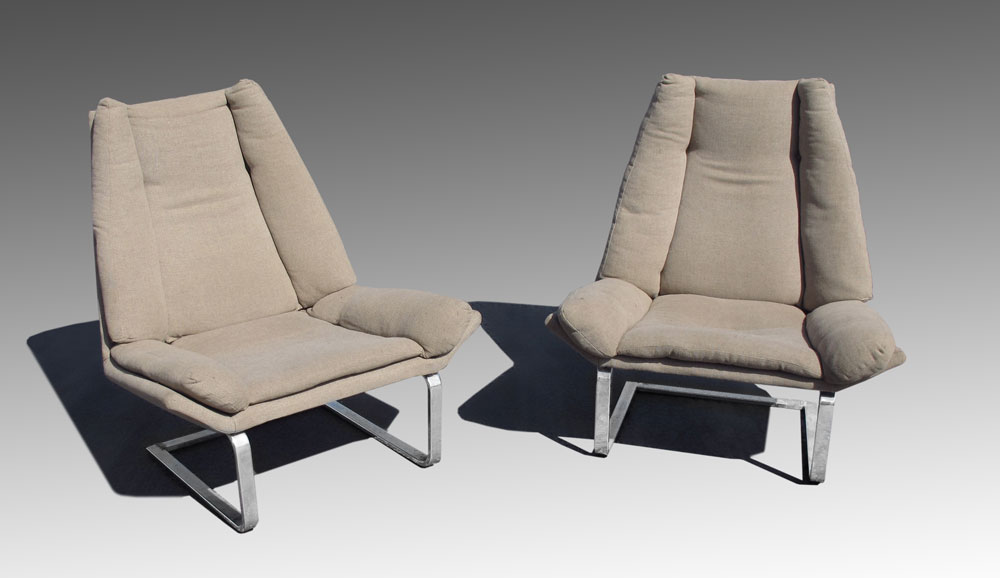 PAIR OF MID CENTURY DESIGNER CHAIRS: Worn grey fabric with chrome base. 38 1/4'' h. x 35 1/2'' x 37''.